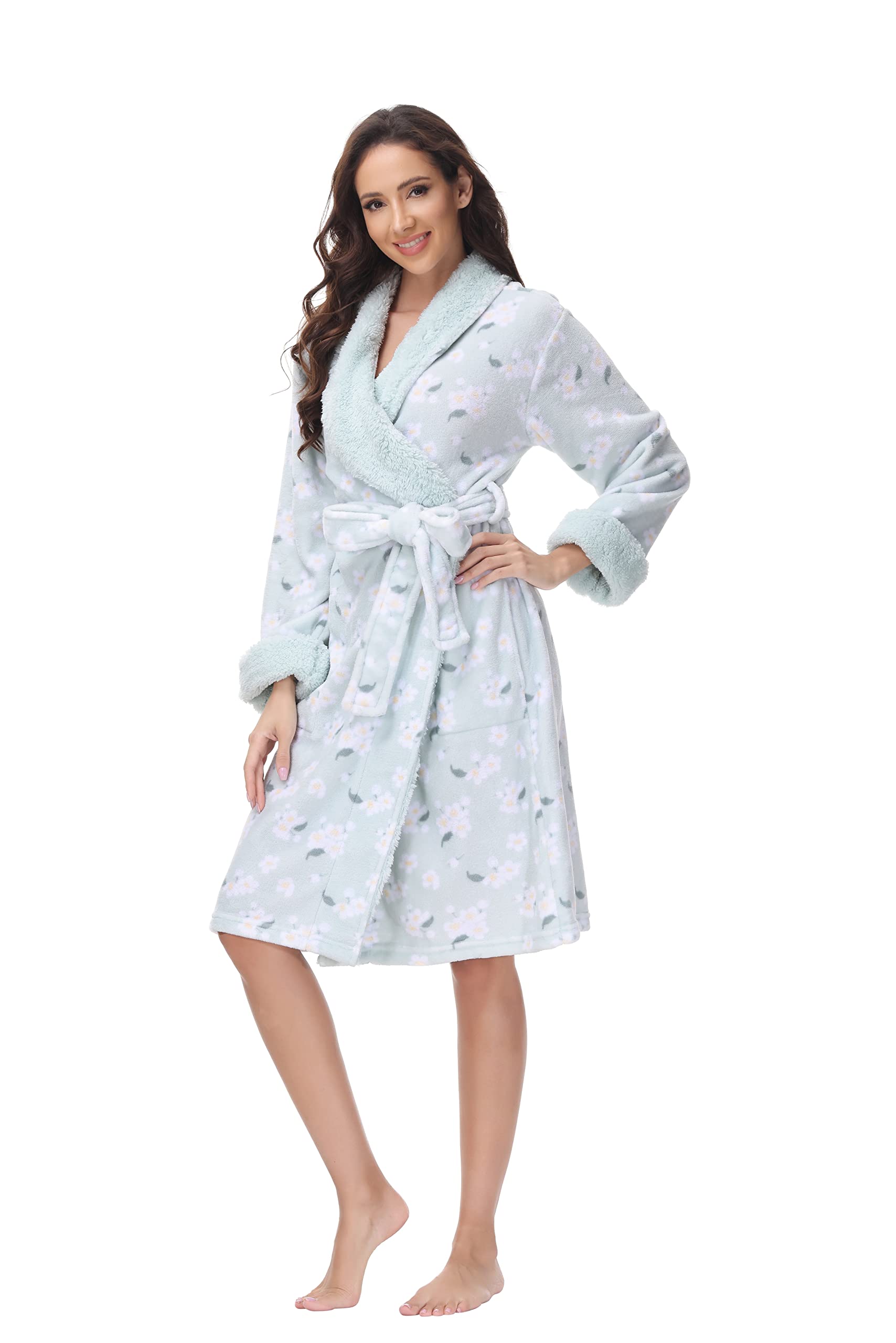 100% Polyester Imported Comfortable plush and soft plush robe ideal for loungewear and front pocket design for added practicality. The bathrobe comes with belt design for snug fitted styling and overalll cute modern design with collar and cuff trim accent for sophisticated look and added warmness. Perfect robe featuring attractive print for relaxing and casual lounging in gym spa or swimming pool and hot tub; it's also a great gift for women on any special ocassion. WASHING IS SIMPLE – Simply machine wash on cold with similar colors. Make it a Gentle cycle and tumble dry on low. Do not iron. SIZE: Please read our provided image size chart and measurement to choose your size.