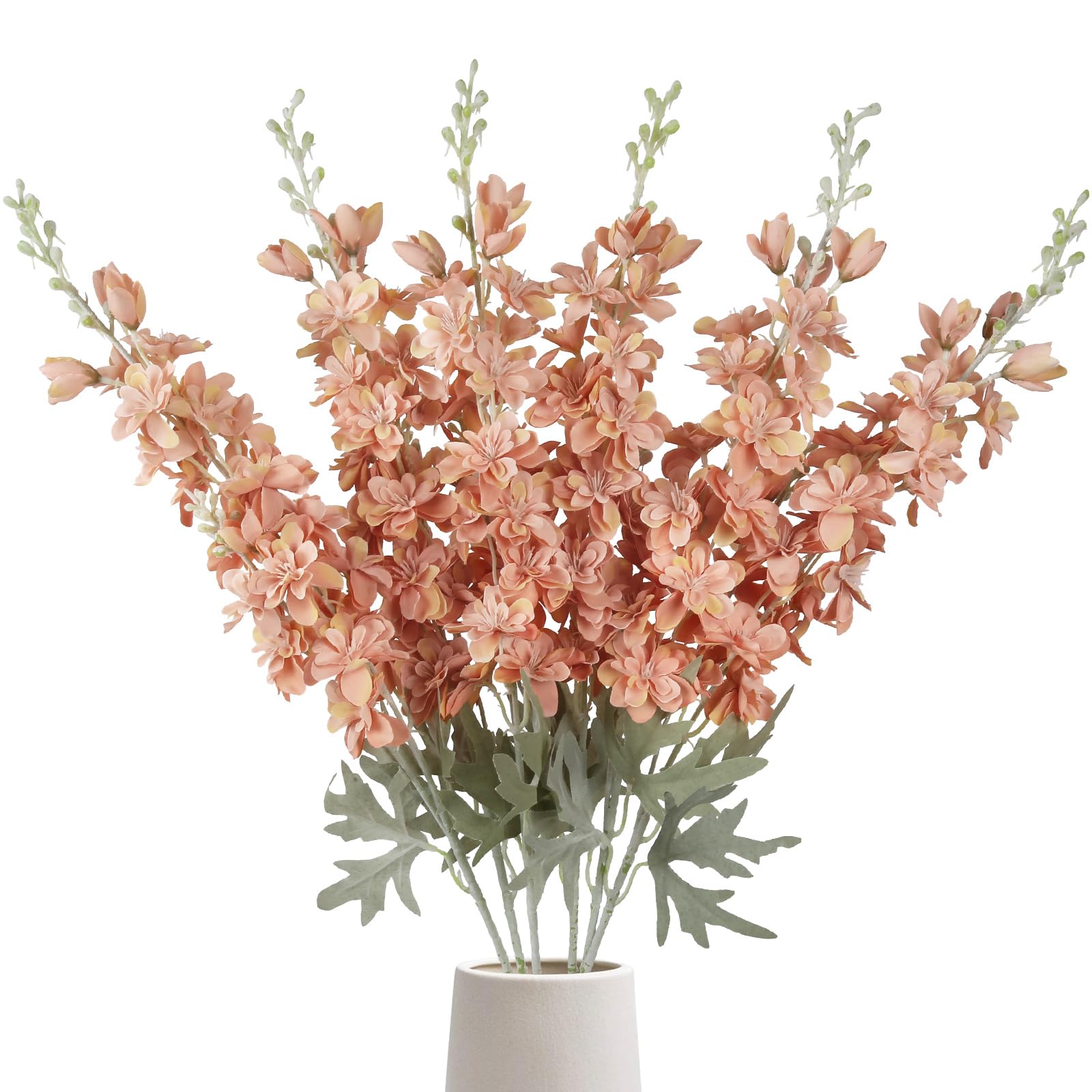 SIZE AND QUANTITY: Delphinium artificial flower is about 33.5 inches/85 cm, total 23 pcs flower heads, flower heads approx 1.96'' in diameter, packing include 6 pcs Delphinium branch flowers LIFELIKE MATERIAL: Artificial Hyacinth Fake flowers have soft and rustic color. The petals are made of silk material, processed by hand and durable.The stem part is made of wire, wrapped inside, and can be easily bent or cut as needed DIY DECORATION: Long stem design, which can be put into a relatively large vase.The stems of Artificial Snapdragon can be bent and adjusted freely to adapt to vases of different heights.Flower heads and leaves can be removed at will EASY TO MAINTAIN: The artificial flowers never fade, are not limited by the seasons, and have richer colors and fuller shapes, require no maintenance, and last a very long time, making them a good choice for people who like delphiniums but don't have time to take care of the flowers SUITABLE: These artificial flower plants are suitable for home, outdoors, indoor, house, garden, outside, table, office, kitchen, bedroom, living room, dining room, meeting, hotel, store, wedding, party decorations IPOPU Delphinium Artificial Flowers 33.5 in Fake Flowers Silk Flowers 6 PCS Larkspur Artificial Flowers Long Stem Artificial Flowers for Tall Vase for Home Wedding Party Decor (Light Coffee)