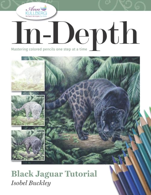 Prefer Instant Download? Download now at www.annkullberg.com Master black fur! Creating black fur in colored pencil is not as easy as it sounds. Beautiful blacks require layering various colors to create folds, shadows and distinctive edges. In this detailed step by step tutorial, Isobel guides you expertly through the process. Learn from this Black Jaguar, then easily apply your new skills to drawing any black fur, clothing and other dark objects. You'll gain even more skills: This tutorial will also show you how to create whiskers, fur patterns and those lovely highlights that really make black fur glow. Plus. learn how to create a completely imaginary, but believable background. There’s a lot to learn from this 28-page tutorial, and you’ll create a lovely piece of wildlife artwork while gaining new knowledge, confidence and techniques. Perfect for intermediate and advanced colored pencil artists. Draw... Frame... Bask in your talent! SUPPLY LIST: Visit https://annkullberg.com/products/black-jaguar-in-depth-tutorial for a complete supply list for this tutorial. The supply list is one of the product images. ABOUT IN-DEPTH TUTORIALS: Created by master colored pencil artists, each In-Depth tutorial features 30+ steps and focuses on teaching you why and not just how the artist applies their technique. No book or video comes close to the amount of instruction in an In-Depth tutorial. Art instruction books typically contain 4-6 steps per demo. That just scratches the surface! With large images and 30 or more steps, In-Depth tutorials truly show you exactly how the artist works, making it easy to truly learn new colored pencil techniques and achieve success. About the Author: Isobel Buckley is a professional realistic wildlife and pet portrait artist living in Bedfordshire, England. She has been drawing and painting for many years, has a fine art degree, is a qualified teacher, and combines her skills to write tutorials and lead workshops. Supply List for this tutorial: Stonehenge Fine Art Paper, White Derwent Lightfast Colored Pencils : Foliage, Grass Green 70%, Lichen Green, Dark Turquoise, Fossil Grey, Autumn Brown, Forest, Mountain Green, Grass Green, Taupe, Mars Black, Green Earth, Black, Nightshade, Bordeaux, Midnight Black, Van Dyke Brown, Racing Green, Dark Indigo, Blue Violet Caran D'ache Luminance: White, Cassel Earth, Spring Green, French Grey 30%, French Grey, Olive Brown 50%, Brown Ochre, Raw Umber 50%, Paynes Grey, Light Aubergine, Light Cobalt Blue, Olive Brown, Burnt Sienna 10% Prismacolor: 20% Warm Grey, Sap Green Light, Indigo Blue, Cream, Black Cherry OTHER MATERIALS: Graphite B Pencil, White Tac (or similar soft poster putty), Tombow Mono Eraser, Electric Eraser,