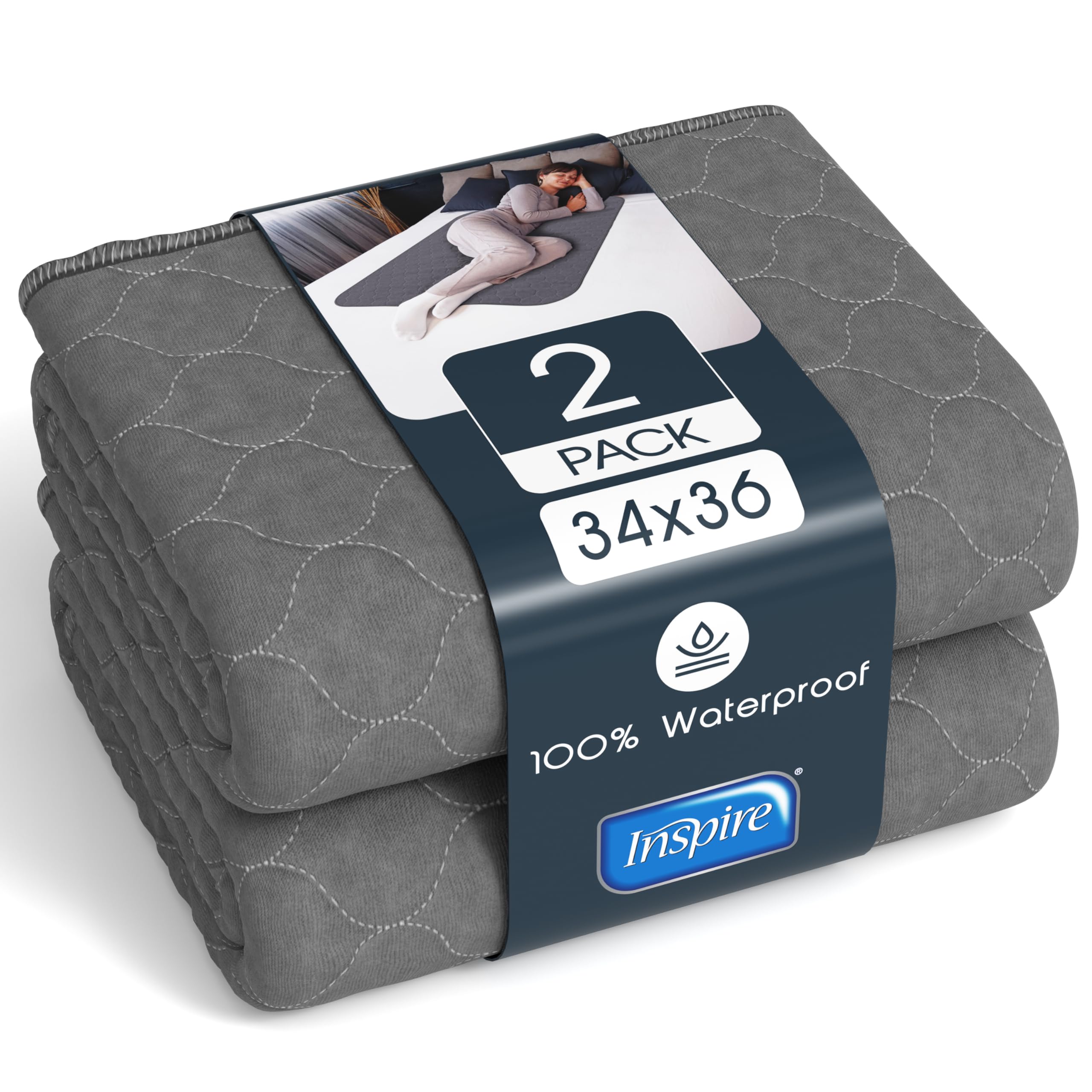 MAXIMUM ABSORBENCY: Inspire Washbale Underpads are super absorbent and more effective than disposable underpads. Waterproof mattress protector, Protect your bed, linen furniture and more from accidents and stains. Ideal for incontinence, bed wetting kids, or as washable pee pads fpr dogs. STAIN HIDING DARK GRAY: Lets face it, an uderpad is not a thing of beauty. The Inspire Bed Liner is dark gray to hide stains, and keep your decor fresh and modern. The Gray bed protector waterproof by Inspire is your ideal choice for washable bed pads for adults. ECONIMICAL, WASH 500X: Machine washable the Inspire Reusable Underpads are not only more absorbent than disposable chux pads / underpads, they are much more economical. 1 pad can save you over 500 disposable pads. FAST DRYING & SAFE FOR SENSITIVE SKIN: Inspire Reusable Pads feature a proprietary quick drying material that speedily wicks liquid and quickly dries keeping sensitive skin free from moisture. The bottom layer is waterproof ensuring your surfaces are protected from leaks. MULTIPLE USES: Potty Training, bed wetting, adult incontinence or pets, the Inspire Reusable Pad has you covered. Ideal for adults struggling with incontinence, Kids, or as pee pads for dogs, puppy pads. EXTRA LARGE FOR MAXIMUM COVERAGE: Huge 34" x 52" size offering maximum coverage for ultimate protection. Protect your bed and other surfaces from leaks and messes. Inspire products are expertly designed to deliver comfort, confidence, and dependable protection for those managing chronic incontinence. LARGE FOR MAXIMUM COVERAGE: Generous 34" x 36" size offering excellent coverage for ultimate protection. Protect your bed and other surfaces from leaks and messes. CHAIR AND SOFA PAD: Sized at 18" x 24", ideal as a chair or sofa pad. Introducing the Inspire Underpads with Stain Hiding Gray, your ultimate solution for managing incontinence, bed-wetting issues, and pet-related accidents effortlessly. Designed to deliver high performance and maximum comfort, these reusable incontinence bed pads are a must-have for any household dealing with such challenges. Whether you need a waterproof mattress protector for bedridden adults or washable pee pads for dogs, the Inspire Underpads offer a versatile and reliable solution. Crafted with premium quality materials that are both durable and soft to the touch, these bed pads ensure that bedding and furniture stay dry and protected. Say goodbye to constantly buying disposable bed pads! The Inspire Underpads stand out as an eco-friendly alternative to traditional pee pads. Their multi-layer construction not only provides superior absorbency but also features a stain-hiding gray top layer that discreetly conceals stains. These underpads are incredibly easy to wash and reuse, making them perfect for anyone looking to reduce their environmental impact while enjoying excellent protection against leaks. Ideal as reusable pee pads for dogs or washable bed pads for adults coping with incontinence issues, these waterproof bed pads ensure long-lasting security. Perfect for use as dog pee pads or adult bed liners - be it underpads for those suffering from recurring accidents or just as a general waterproof bed protector - we have thought of everything so you dont have to worry about anything. Say farewell to inefficient makeshift solutions; choose the Inspire Underpads and experience the ultimate peace of mind knowing youre fully protected day in and day out. Choose the dependable convenience of Inspire Underpads today: your smart choice for an eco-friendly yet highly efficient approach towards managing lifes little mishaps!