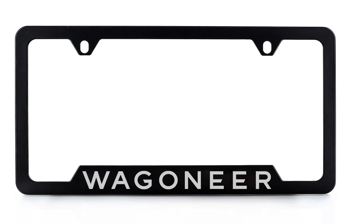 This Wagoneer License Plate Frame is a Jeep Official Licensed Product. Listing is for ONE License Plate Frame Made of Durable Black Powder Coated Zinc Alloy. 12 Inches long and 6 inches tall. Designed to fit all standard DMV License Plates for US and Canada. Wagoneer precision engraved design on a quality metal license frame.