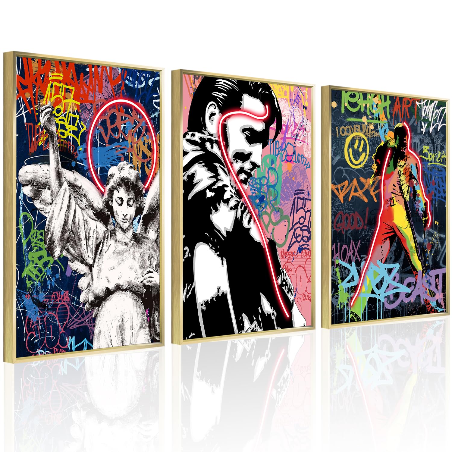 Vibrant 3-Piece Graffiti Wall Art:This set of 3 graffiti canvas prints features an angel, rock singer, and dancer in bold, colorful street art. Perfect for modern home décor, it adds personality and energy to any room. Urban Street Art for Contemporary Interiors:Bring an urban touch to your living room, bedroom, or office with this set of dynamic graffiti art prints. The colorful designs create a stylish, contemporary look for modern spaces. Premium Canvas with Gold Frame or Unframed:Available with a gold metal frame or unframed, these canvas prints are made of high-quality materials, ensuring vibrant and long-lasting artwork for your home or office walls. Ideal for Living Room, Bedroom, or Office Décor:Perfect for enhancing the ambiance in your living room, bedroom, or office, this set of 3 modern canvas prints brings life and style to any wall, making it a focal point of your décor. Great Gift for Art and Music Lovers:This colorful street art set is an ideal gift for art enthusiasts, music fans, or anyone who appreciates modern, urban art. A perfect choice for birthdays, housewarmings, or special occasions.