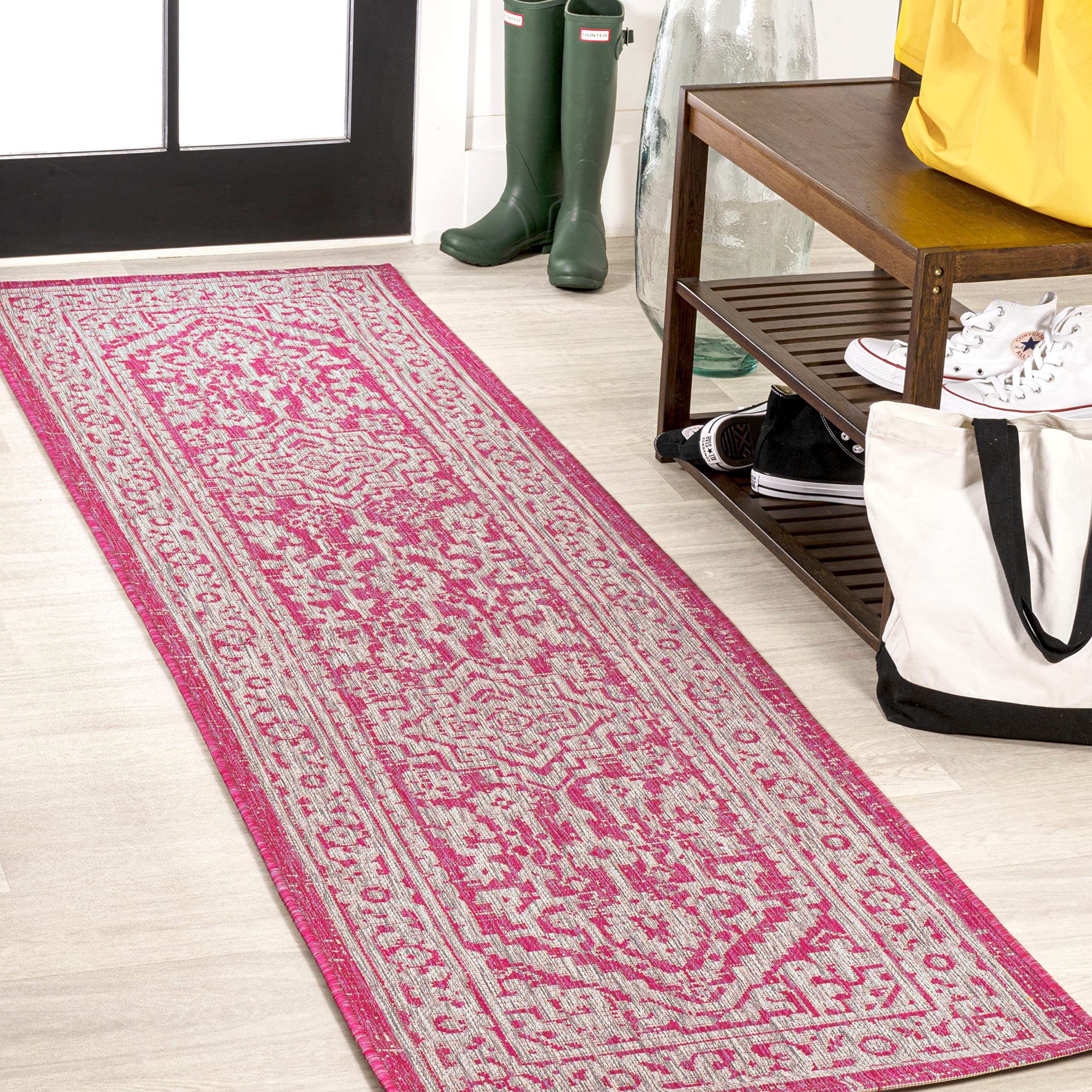 INDOOR/OUTDOOR DURABILITY: Give your patio, deck or porch an instant makeover with an indoor/outdoor rug; Low-pile synthetic rug fibers are durable for high-traffic spaces like the kitchen, mud room or entry; Perfect for families with kids STAIN-RESISTANT AND PET-FRIENDLY: This rug is made from synthetic fibers that resist UV fading; The pet-friendly low-pile construction won’t accumulate dirt, and spills clean up easily; It’s been machine-woven so the rug fibers will stay put EASY TO CARE FOR: To wash an outdoor rug, spray the surface with a 5-1 mixture of mild dish soap and water; Then rise thoroughly with a garden hose and hang over a railing to dry thoroughly Water resistance with 0.19" pile Fuchsia and cream with a handwoven mingled texture