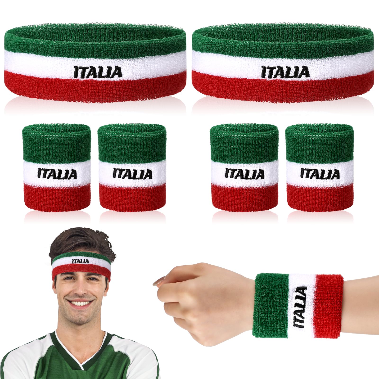 Italian Costume Set: these headbands and wristbands set feature large "ITALIA" lettering and the colors of the Italian flag, ideal for sports events, daily sports, party makeup, to showcase your love and support for Italy, nice Christmas or birthday gifts Suitable Size: our set comes with 2 pcs Italy headband, measuring about 7.09 x 2.17 inches/ 18 x 5.5 cm, and 2 pairs of Italy wristbands measuring about 3.15 x 3.15 inches/ 8 x 8 cm; With good elasticity, can be easily stretched, suitable for most adults Sweat Absorption Material: sports sweatband set includes 2 headbands and 2 pairs of wristbands, made of polyester cotton, latex silk, and spandex, with soft texture, strong sweat absorption, good breathability, not easily deformed for long term wear Fixed Easy: our sweat resistant headband and wristband have nice elasticity and can be kept in place without constant adjustment, ideal for use in gym, basketball, soccer, tennis, track running, walking, yoga, badminton, baseball and other sports exercise Easy to Clean: our Italian headbands and wristbands are machine washable that can be easily cleaned and reusable after sweating, whether you're playing soccer, tennis, or yoga, making it convenient for your daily exercise routine Features: Our sweat absorbing headband and wristband are designed in bright colors, stylish and comfortable, making them ideal for pairing with various team jerseys. This head sweatband and wristband set has good breathability, making it an ideal choice for comfort and concentration during various sports exercises. Specifications: Material: polyester cotton, latex silk, and spandex Color: red, green, white Size: Headband: about 7.09 x 2.17 inches/ 18 x 5.5 cm Wristbands: about 3.15 x 3.15 inches/ 8 x 8 cm Package includes: 2 x Headband 2 Pairs of wristbands Notes: Manual measurement, please allow slight errors on size. The color may exist a slight difference due to different screen displays.