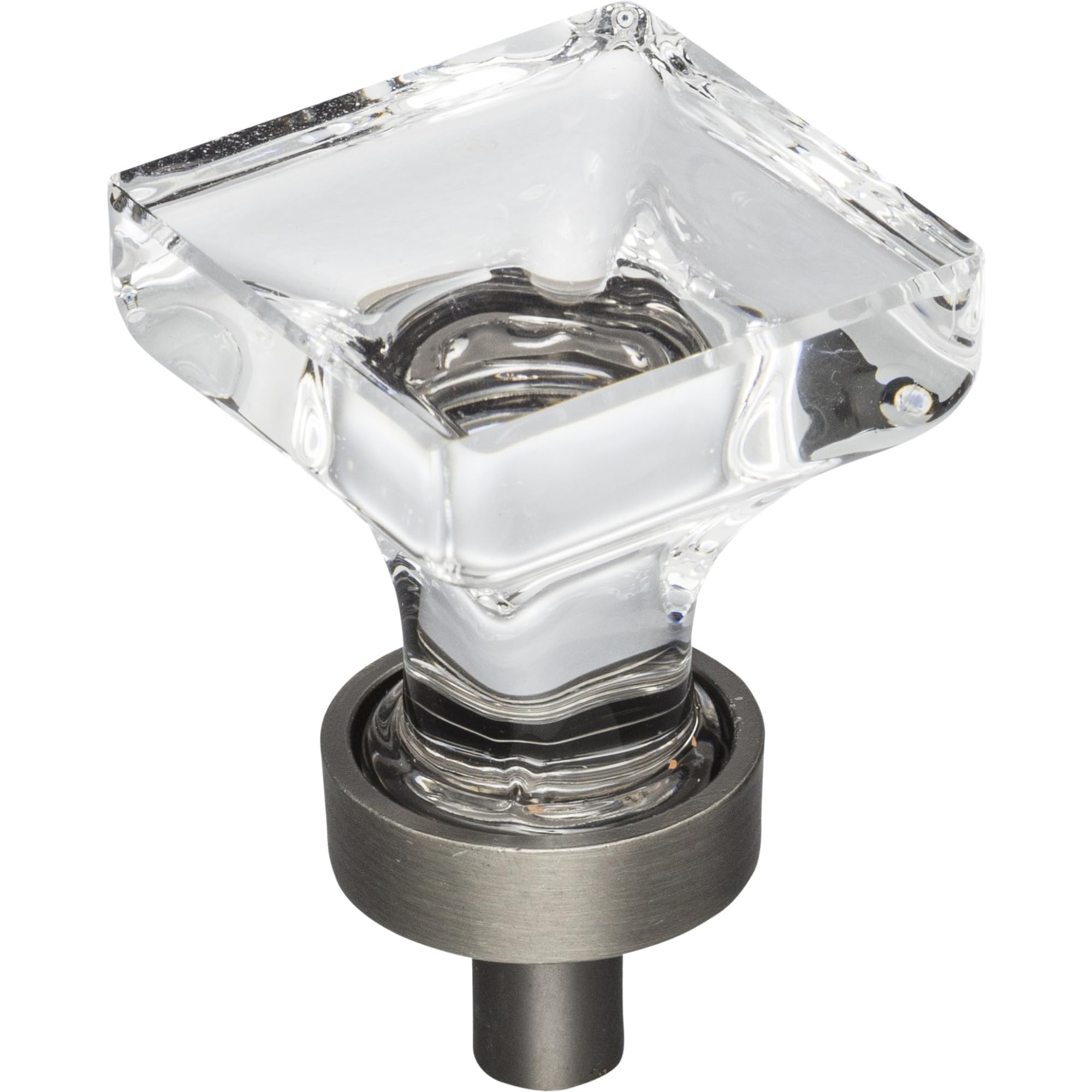 Perfect for Kitchens, Baths, Closets and Furniture Finish - Brushed Pewter 1" Overall Length Brushed Pewter Square Glass Harlow Cabinet Knob Recalling the glamorous era of Old Hollywood, Harlow glass knobs add excitement and radiance to any kitchen, bath, or closet. This opulent square shape cabinet knob is available in two sizes to add a touch of modern elegance to any space. This Jeffrey Alexander collection offers four finish options, meeting both traditional and transitional design needs. Each item is individually wrapped to protect the item from damage. Attachment hardware is included. Features: Constructed of materials for lasting durability Coordinates with other items from the Harlow collection 8-32 x 9/16 screw(s) included for easy installation Covered by a limited Includes 1 knob Specifications: Length: 1" Width: 1" Projection: 1-5/8" Elements: Glass Cabinet Knob, Glass Drawer Knob, Glass Closet Knob, Glass Furniture Knob