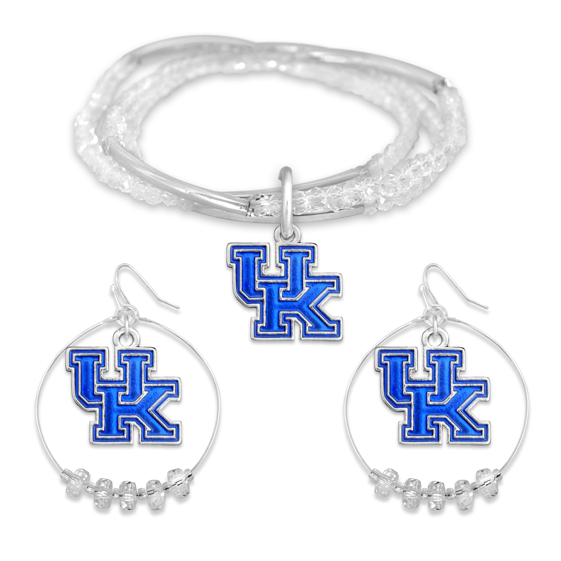 Official Kentucky Wildcats Jewelry Set: Show off your spirit with this officially licensed combo featuring iridescent team logo charms on both a bracelet and hoop earrings. Lightweight Hoop Earrings: These 2" silver tone hoops include 5/8" iridescent logo charms and team-colored beads, offering a modern and comfortable fan style. Chic Kentucky Bracelet: The silver tone bracelet features a matching 5/8" iridescent charm and colored beads to coordinate with any outfit or game-day look. Perfect Gift for Fans: Whether it’s for yourself or another Kentucky Wildcats fan, this jewelry set is a great choice for birthdays, holidays, or tailgating accessories. Crafted for Everyday Wear: This officially licensed set delivers a fashionable blend of team pride and comfort, with durable materials and lightweight design. Support your team in style with this officially licensed Kentucky Wildcats jewelry combo set, featuring a silver tone bracelet and matching hoop earrings. Each piece showcases a 5/8" iridescent team logo charm, accented with colorful beads that reflect your school spirit. The 2" lightweight earrings provide a sleek, wearable fit, while the bracelet ties the look together with modern flair. This NCAA licensed set makes a stylish gift for fans or a perfect personal accessory for any occasion. Lightweight, vibrant, and ready to show your pride.