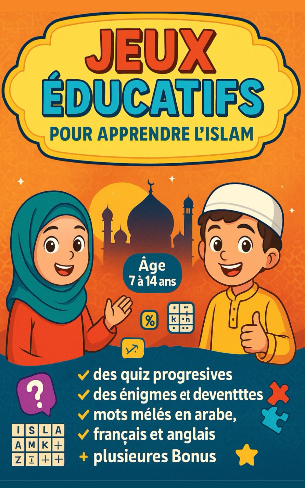 📚 Jeux Éducatifs pour Apprendre l’Islam 🌙 Apprendre sa religion en s’amusant, c’est possible ! Ce livre unique en son genre transforme l’apprentissage de l’Islam en une véritable aventure ludique et interactive. Parfait pour les enfants de 7 à 14 ans, il mêle éducation et plaisir pour renforcer la foi tout en développant la réflexion. À l’intérieur de ce livre captivant : Des quiz progressifs pour tester ses connaissances sur l’Islam, les prophètes, le Ramadan, les piliers de la foi, les sourates... - Des énigmes et devinettes originales pour faire travailler la logique et la mémoire tout en découvrant des faits religieux fascinants. - Des mots mêlés en arabe, français et anglais pour enrichir le vocabulaire islamique dans trois langues. - Des défis créatifs : créer une BD islamique, rédiger une lettre à Allah, réaliser une affiche sur les 5 piliers… - Des labyrinthes et lettres mélangées pour stimuler l’esprit tout en s’amusant. - Des bonus exclusifs : hadiths authentiques, sourates expliquées, douas utiles et petites pépites de culture générale islamique. - Un contenu varié et structuré , parfaitement adapté aux enfants musulmans francophones, à la maison ou en classe. 🎁 Bonus spécial : Apprentissage de l’arabe et de l’anglais à travers des activités simples et efficaces + Douas essentielles du quotidien ! 🧠 Objectifs pédagogiques : Mieux connaître l’islam et ses fondements - Stimuler la réflexion, la mémoire et la créativité - Créer des moments ludiques en famille ou entre amis - Ancrer les apprentissages religieux de manière durable 📘 Un compagnon idéal pour chaque jeune musulman en quête de savoir, de spiritualité… et de fun !