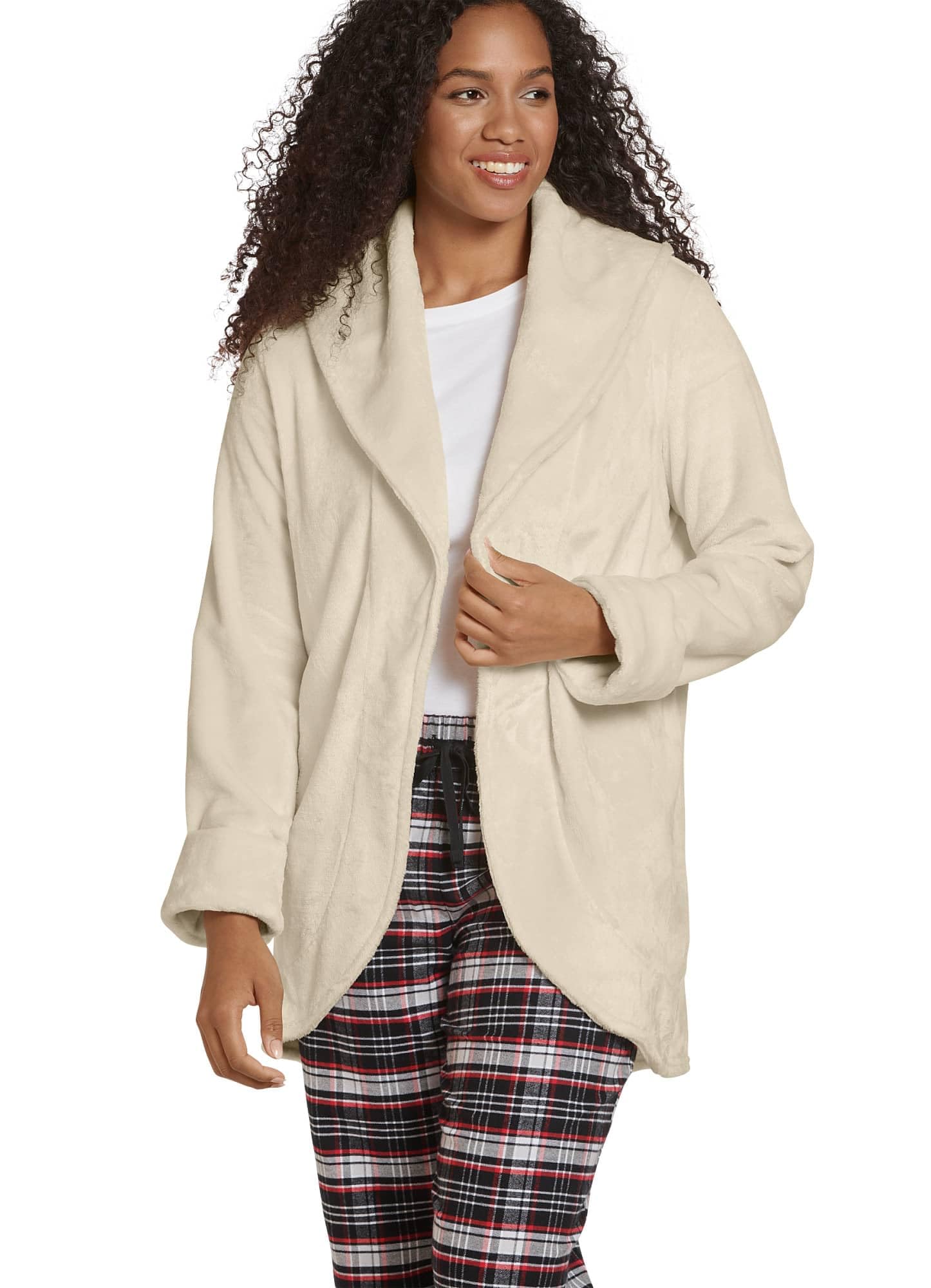Style 2847 Relaxed fit Wide, shawl-style collar Cozy, double-sided plush for warmth 33" length Your winter wardrobe has never been cozier or cuter with the Jockey plush Cardigan. Made with soft plush fleece, this comfy style provides blanket-like warmth for chilly days and snuggly nights. Featuring a wide, shawl-style collar, cuffed sleeves, and an easy, relaxed fit, this is a flattering cardigan you ll never want to take off.