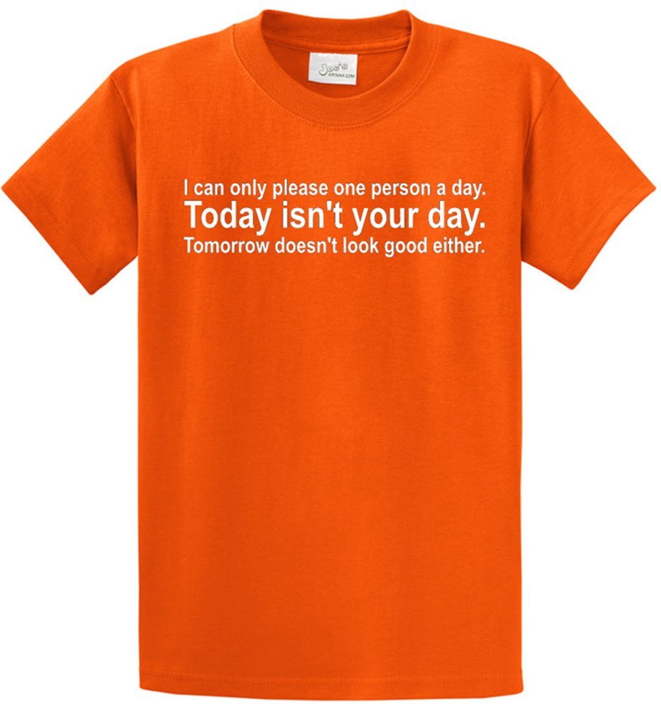 Joe's USA - I Can Only Please One Person a Day. Today Isn't Your Day. Tomorrow Doesn't Look Good Either - Fun Tee's . Heavyweight 6.1-ounce, 100% cotton T-Shirts in 50 Colors and Sizes S-6XL. Printed with Joe's USA TM Logo Inside Heavyweight 6.1-ounce, 100% cotton (preshrunk) Shoulder-to-shoulder taping Coverseamed neck Double-needle hem Adult Sizes: S-6XL Joe's USA - I Can Only Please One Person a Day. Today Isn't Your Day. Tomorrow Doesn't Look Good Either - Fun Tee's . Heavyweight 6.1-ounce, 100% cotton T-Shirts in 50 Colors and Sizes S-6XL. Printed with Joe's USA TM Logo Inside