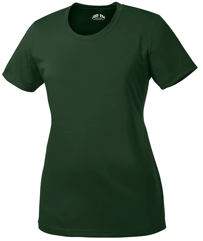 Joe's USA Women's Athletic All Sport Training T-Shirt Gently contoured silhouette. Slight scoop neck. 3.8-ounce, 100% polyester Double-needle sleeves and hem Printed with Joe's USA Logo on Sleeve In Sizes: X-Small (size-2), Small (4-6), Medium (8-10), Large (12-14), X-Large (16-18), 2X-Large (20-22), 3X-Large (24-26), 4X-Large (28-30) Quick dry moisture management fabric is specially constructed to allow full range of motion while keeping you dry and comfortable. 3.8-ounce, 100% cationic polyester interlock . Gently contoured silhouette. Slight scoop neck. Double-needle sleeves and hem the Joe's USA All Sport Training Tee delivers
