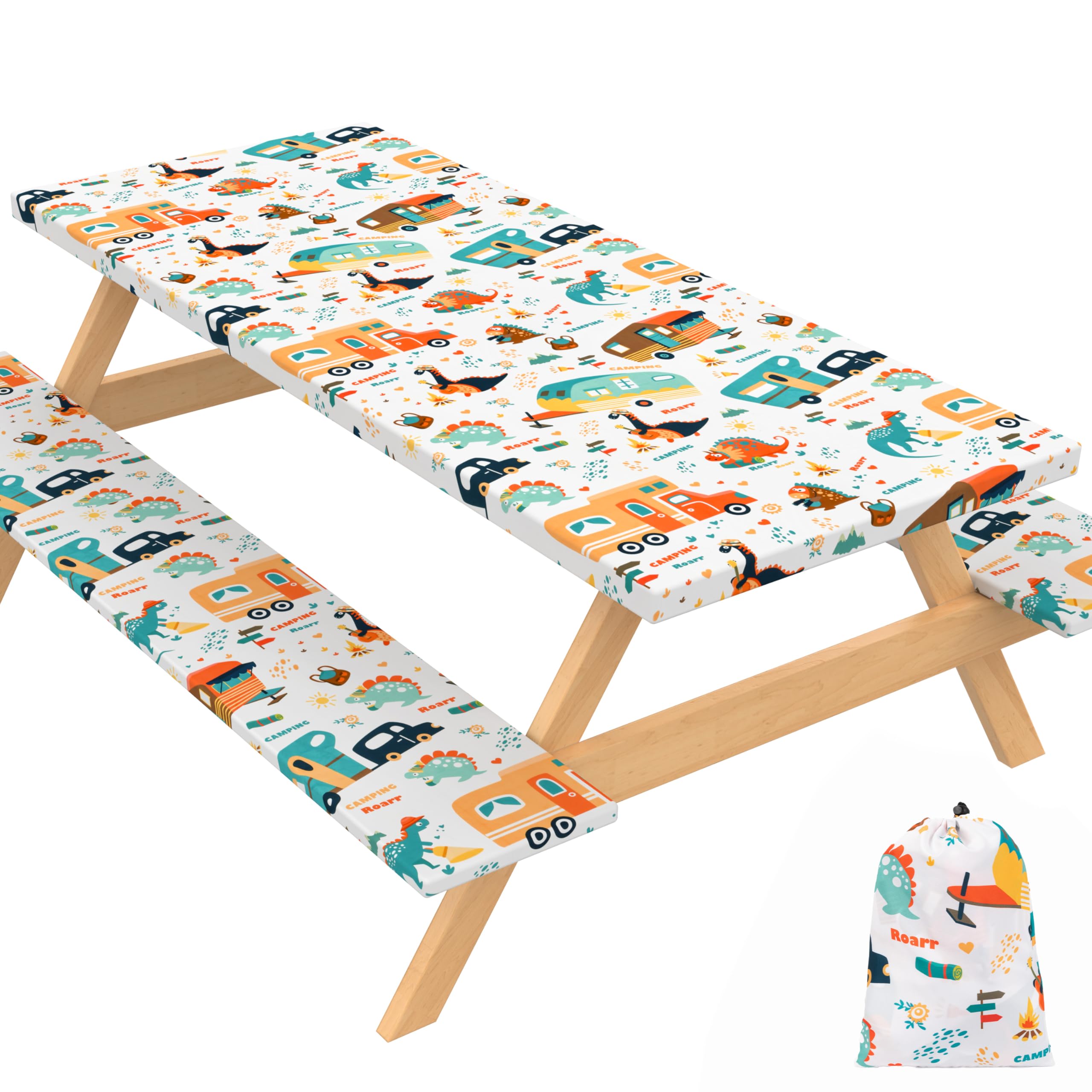 HEAVY DUTY 100% POLYESTER: Not made of cheap PVC or plastic. This camping table cloth is rip-proof and machine washable. It will be enjoyed for many summers. It is a great gift idea! FITS 6 FT TABLES & BENCHES: With the design of all-around elastic, this picnic table and bench cover set fits 6 ft picnic tables and benches snugly. Only one person is needed for installing the set. Wonderful for all outdoor and indoor occasions including children’s birthday parties and family gatherings. QUALITY, THICK AND RIP-PROOF: Made of durable 100% polyester material with a high standard weight of 180 grams per square meter (GSM). The rip-proof picnic table tablecloth is thicker and lasts longer than most other tablecloths. EASY TO CLEAN: The camping table clothes are water repellent and stain resistant. Users can clean the spills like ketchup, wine, and grease with a simple wipe (works better using a wet towel). DIMENSIONS AND ACCESSORIES: The full size of the tablecloth is 72 inch X 30 inch and size of the bench cover is 72 inch X12 inch. A lovely matching bag is also included for easy storage and travel. Jolly Camper’s new fitted “Dinosaur and Camping” pattern indoor/outdoor picnic tablecloth will bring more fun to your campsite, RV trips, picnic adventures and beach style parties. It will put a smile on your face when used in your home, patio, or park. The whimsy Dinosaur and Camping print provides a unique and enjoyable dining experience. Your guests will happily be asking where you got the stylish and eye-catching tablecloth and bench covers from. In addition to the fun design, the strong 100% polyester (180GSM) material makes it durable, washable and easy to clean. It is water/oil proof so you can clean it with a simple wipe. The all-around elastic design, makes it a perfect fit for any outdoor 6 ft tables and benches. The storage bag makes it convenient for outdoor and indoor usage. The durable tablecloth and bench covers with its fun camper pattern will brighten your upcoming gatherings this year. Roarr!