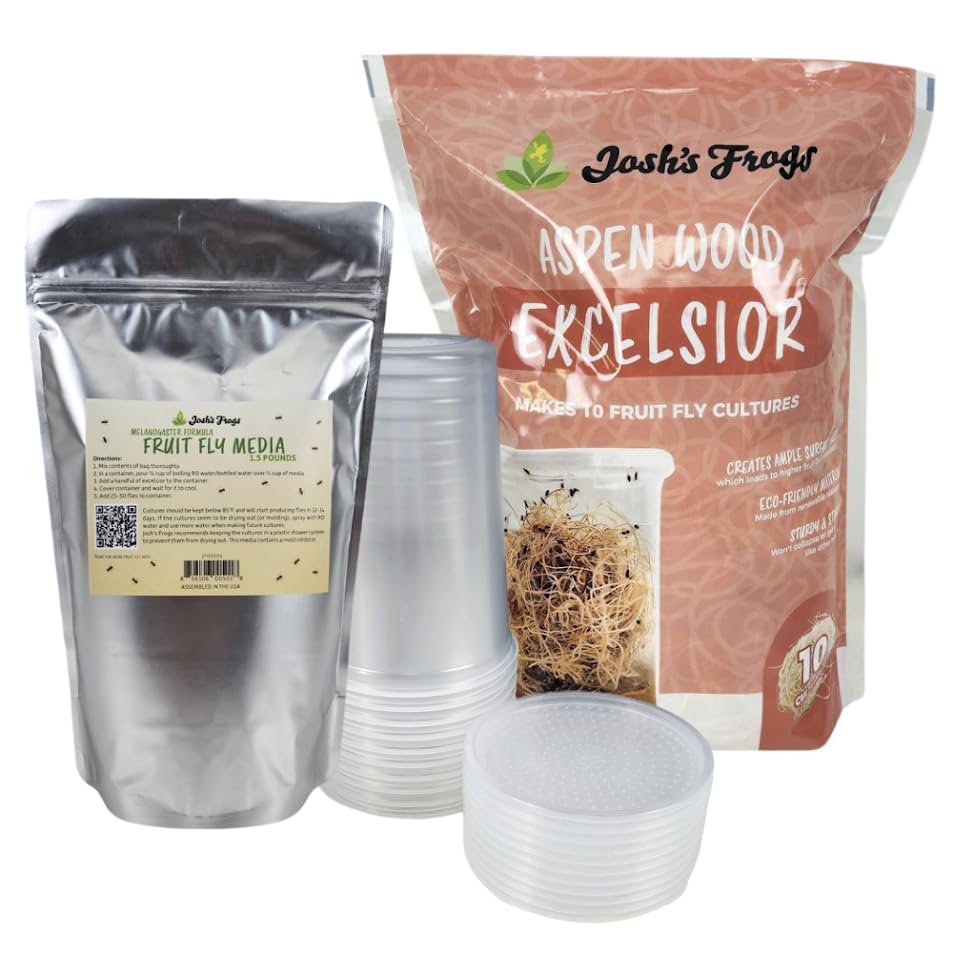 The Josh's Frogs Melanogaster Fruit Fly Culture Kit (makes 10 32oz Fruit Fly Cultures) has everything you need to make 10 cultures of flightless melanogaster fruit flies, and includes: