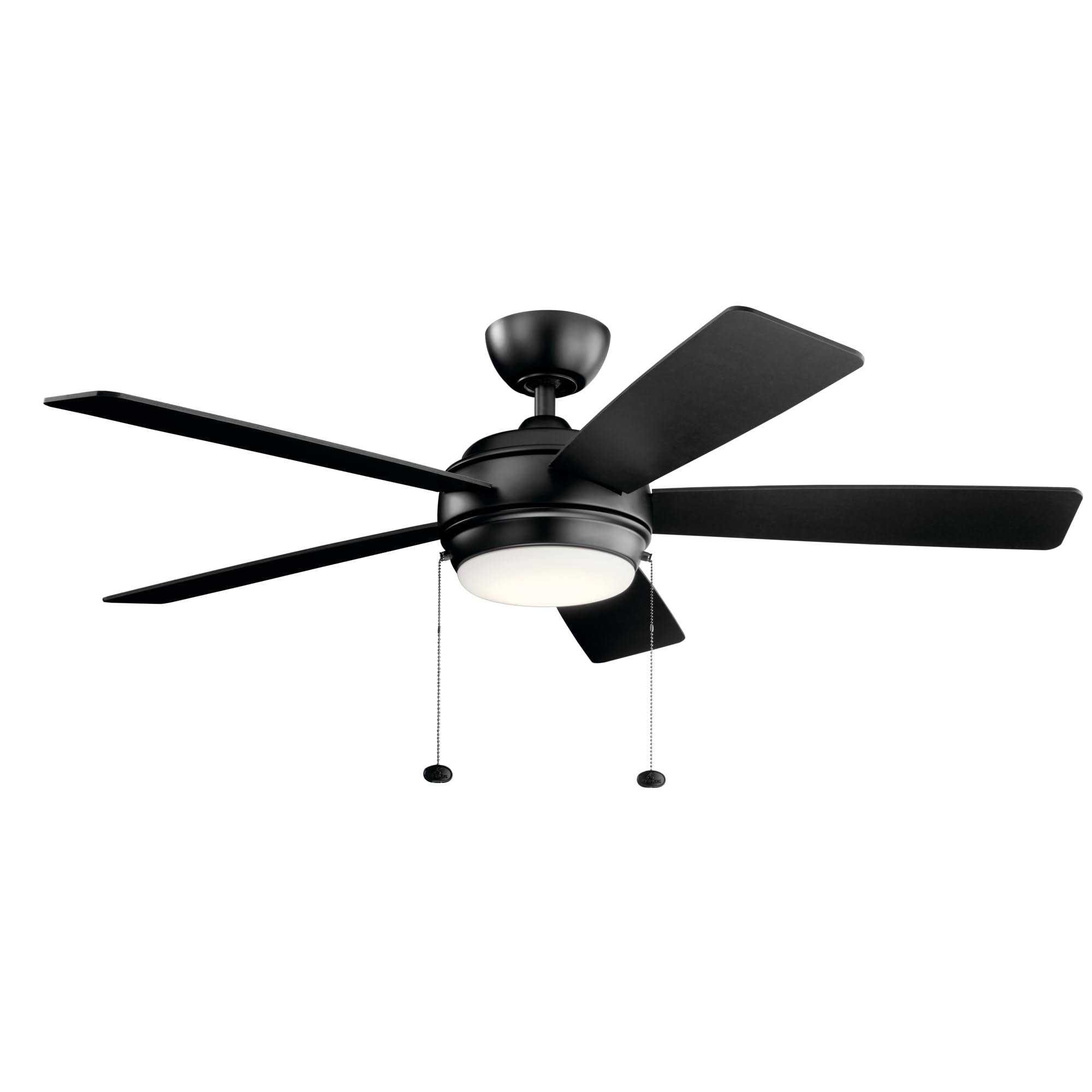 Make a fashionably bold statement in your home, whether traditional or transitional, with this classic design highlighting strong, sleek lines in Satin Black with reversible silver and black blades and Etched Cased Opal Glass Includes a 17 Watt dimmable integrated LED light source Provides ambient lighting and overall illumination to the area Works with ceilings up to 30 degree or 7/12 pitch