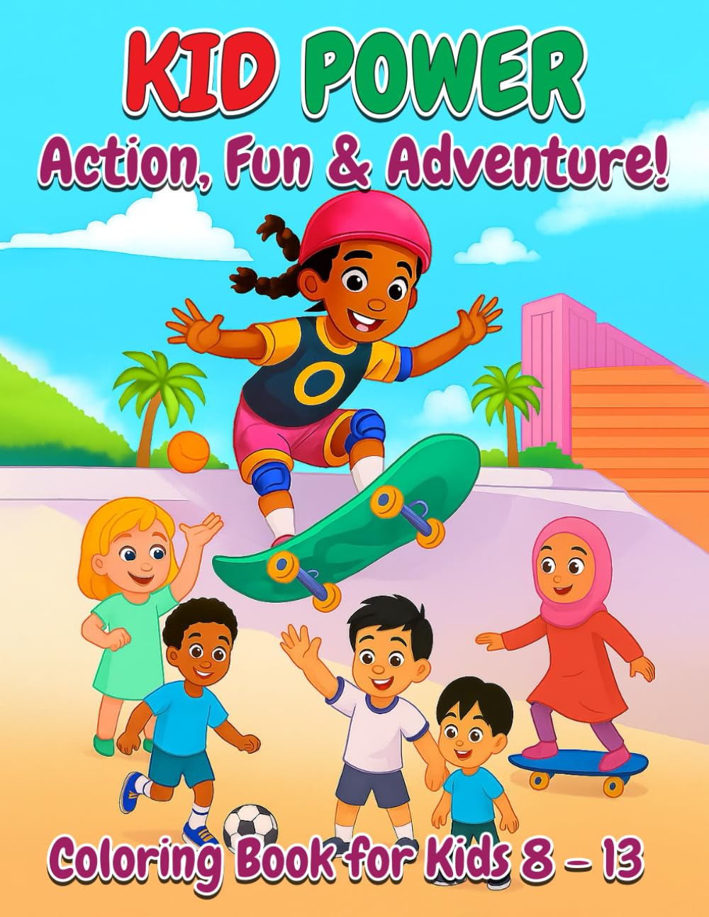 KID POWER! Action, Fun & Adventure! An Epic Coloring Book for Kids Ages 8 to 13 Who Love to Imagine, Move, Explore, and Play! Get ready to dive into the ultimate adventure with KID POWER! Action, Fun & Adventure! — a high-energy coloring book made for bold, curious, and unstoppable kids who love the outdoors, sports, exploring, and hanging out with friends! Packed with excitement and bursting with big, bold illustrations, this action-filled coloring book is perfect for kids ages 8 to 13 who crave fun, movement, and adventure. Whether you're flipping your skateboard at the local skate park, racing your bike through the neighborhood, or building forts with your best friends, KID POWER! captures it all in pages you can bring to life with your favorite colors. What’s Inside? Inside this coloring book there are: 83 Total Pages - 40 Coloring Images - Single sided printing - Page Size: 8 ½ x 11 Skateboarding & Bike Riding Action Shred the skateboard ramps and master your moves! Kids will color scenes of cool tricks, ramps, and fearless riders showing off their skateboarding skills. Team Sports & High-Fives Soccer, basketball, baseball, and more — this coloring book celebrates the joy of team spirit, fun, and activity. Outdoor Exploration & Nature Adventures Grab your backpack and head outside! Explore hiking trails, go camping, and skiing – celebrate the wonder of nature. Kids can color their way through hiking, camping, and getting to know awesome animals! Water Fun Learn about water animals and have fun exploring water sports while filling in the pages of this kids coloring book. Real Friendships, Real Fun Whether it’s riding bikes, heading home with a friend, or playing board games, the moments that matter most are the ones spent with friends. Creative Confidence on Every Page With bold, easy-to-color designs, this kids coloring book invites kids to express themselves freely, without rules. There’s no “right” way to color an adventure — it’s all about bringing your imagination to life! Why Kids (and Grown-Ups!) Love KID POWER!: *Supports Creativity and Self-Expression Every kid is unique, and so is every page! Whether they prefer bold colors, pastels, or wild designs, kids can express who they are with every crayon or marker stroke. * Aims to Build Confidence and Positivity By highlighting kids doing awesome things — alone and together — this coloring book promotes positive messages of strength, teamwork, independence, and friendship. * Fun for All Seasons Rainy day? Road trip? Lazy weekend afternoon? This kids coloring book is the perfect companion for any downtime when kids want a break from screens and a boost of fun. KID POWER! Action, Fun & Adventure! is a great gift for adventurous boys and girls who love sports, exploration, and creative play. It’s a great birthday surprise, summer activity, or back-to-school pick-me-up. Whether your kid is an artistic creative, a rising athlete, a nature explorer, or just someone who loves being on the go, this coloring book is made to match their energy. So, grab your coloring tools, rally your friends, and let the adventure begin with KID POWER! Action, Fun & Adventure!