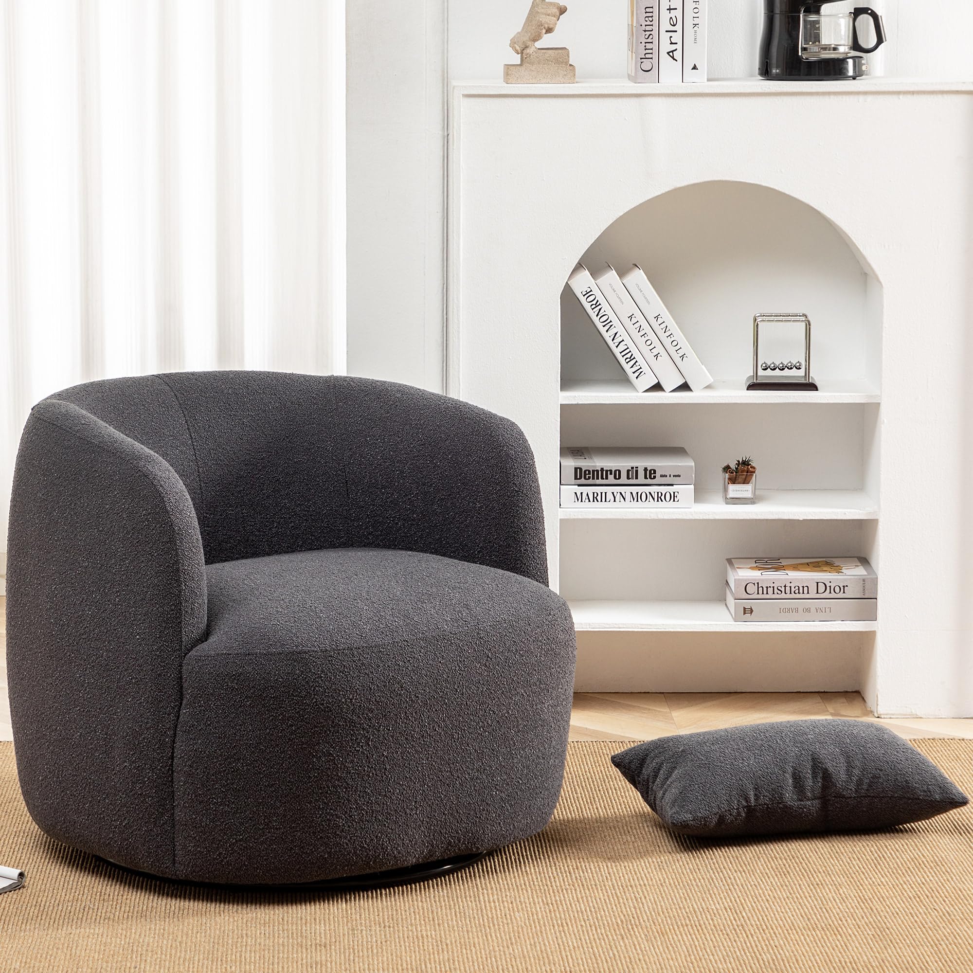 34-IN WIDENED BARREL CHAIR - It's different than the tiny 25.6-inch barrel chair size on the market. KINWELL boucle swivel barrel chair overall size: 32.7'' D X 34'' W X 29'' H. Weight: 50 lbs. With a seat size of 16.5'' H X 24.8'' W X 24.8'' D. Come with a removable toss pillow gives a little more support for your lower back. The space is comfortable enough for an adult to read or rest A SOLID ACCENT ARMCHAIR - Super broad heavy-duty metal base to keep it as stable as when swivel, comes with pads to keep scratches from hard floor or carpet, solid pine wood frame support, and exquisite workmanship to ensure this round swivel barrel chair is sturdy and long-lasting, with a weight-bearing capacity of 300 lbs 360 DEGREE SWIVEL - Our stylish 34inch widened and enlarged barrel chair features a super broad heavy-duty sturdy metal base, which makes this large barrel chair swivel 360 degrees smoothly, making it the perfect companion for a bedroom or living room and is excellent for small spaces. It allows you to effortlessly change your focus and communicate with everyone in the room without standing up or repositioning the chair BOUCLE UPHOLSTERY—This large Mid-Century Modern Swivel Barrel Chair is crafted with luxurious, popular boucle upholstery. It provides a cozy, soft seating experience that instantly elevates your relaxation and comfort, especially on cold days or when you are alone, bringing you the warmth of spring MULTIPLE USE - No assembly design to make this swivel accent chair easy to use on most indoor occasions. The elegant, full, round, barrel-shaped design is perfect for various spaces, such as your living room, nursery, bedroom, office, reading room, hotel lobby, or other small spaces. It is a perfect addition to your home or hotel lounge UNITED STATES DESIGN PATENT - Designed with precision and attention to detail. Its sleek contours, coupled with premium materials, create a visually striking masterpiece that instantly captivates attention. The seamless integration of form and function ensures a seamless user experience. With its United States Design Patent and exclusive sales rights, this 34 inch barrel chair represents a pinnacle of innovation and serves as a testament to our commitment to delivering exceptional products to our valued customers KINWELL 34" W Mid Century Modern Swivel Barrel Chair, Round Upholstered Boucle Armchair Accent Chair, No Assembly Single Sofa Chair with Toss Pillow for Living Room Bedroom Apartment Nursery, Dark Grey