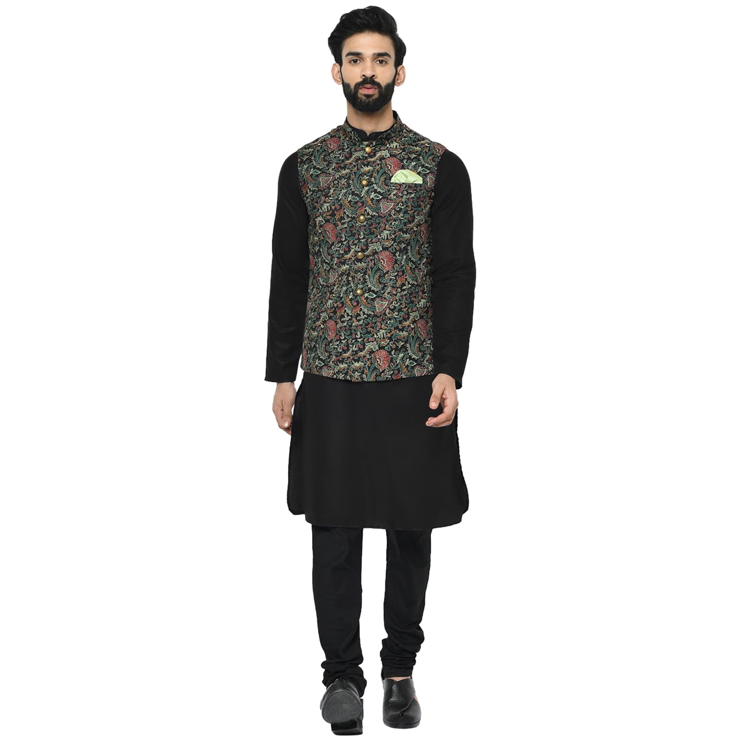 ELEGANT FESTIVE ENSEMBLE – This kurta jacket set for men features a refined printed design with a Mandarin collar, perfect for weddings, festivals, and traditional occasions. PREMIUM PURE COTTON FABRIC – Crafted from breathable and skin-friendly pure cotton, this men’s ethnic set offers natural comfort and softness for long festive hours. COMPLETE 3-PIECE ETHNIC LOOK – The set includes a printed ethnic jacket, a complementary kurta, and a matching churidar—perfectly coordinated for a stylish festive appearance. FLATTERING REGULAR FIT – Tailored in a regular fit to suit all body types. Available in sizes S to XL. Please refer to the size chart before ordering. IDEAL FOR GIFTING & CELEBRATIONS – A thoughtful choice for Diwali, Eid, weddings, and family functions. Makes a wonderful gift for husbands, fathers, brothers, or friends. Step into celebration mode with the KISAH Men’s Kurta Jacket Set, a beautifully crafted ethnic outfit designed for today’s man who embraces classic tradition. This 3-piece ensemble includes a printed jacket, solid kurta, and matching churidar, all made from pure cotton for natural breathability and ease. The ethnic jacket features a Mandarin collar, front button placket, and a subtle printed design, adding a refined finish to your festive look. Combined with the kurta and churidar, this set brings elegance, comfort, and cultural richness to every special occasion. Perfect for Diwali, Eid, weddings, family gatherings, and more—it’s a go-to choice for celebrations with style. Product Details: What’s Included: 1 Printed Jacket + 1 Kurta + 1 Churidar Material: Pure Cotton Pattern: Printed Fit: Regular Fit Style: Ethnic Kurta Jacket Set with Churidar Occasions: Weddings, Diwali, Eid, Rakhi, Navratri, Family Functions, Festive Parties