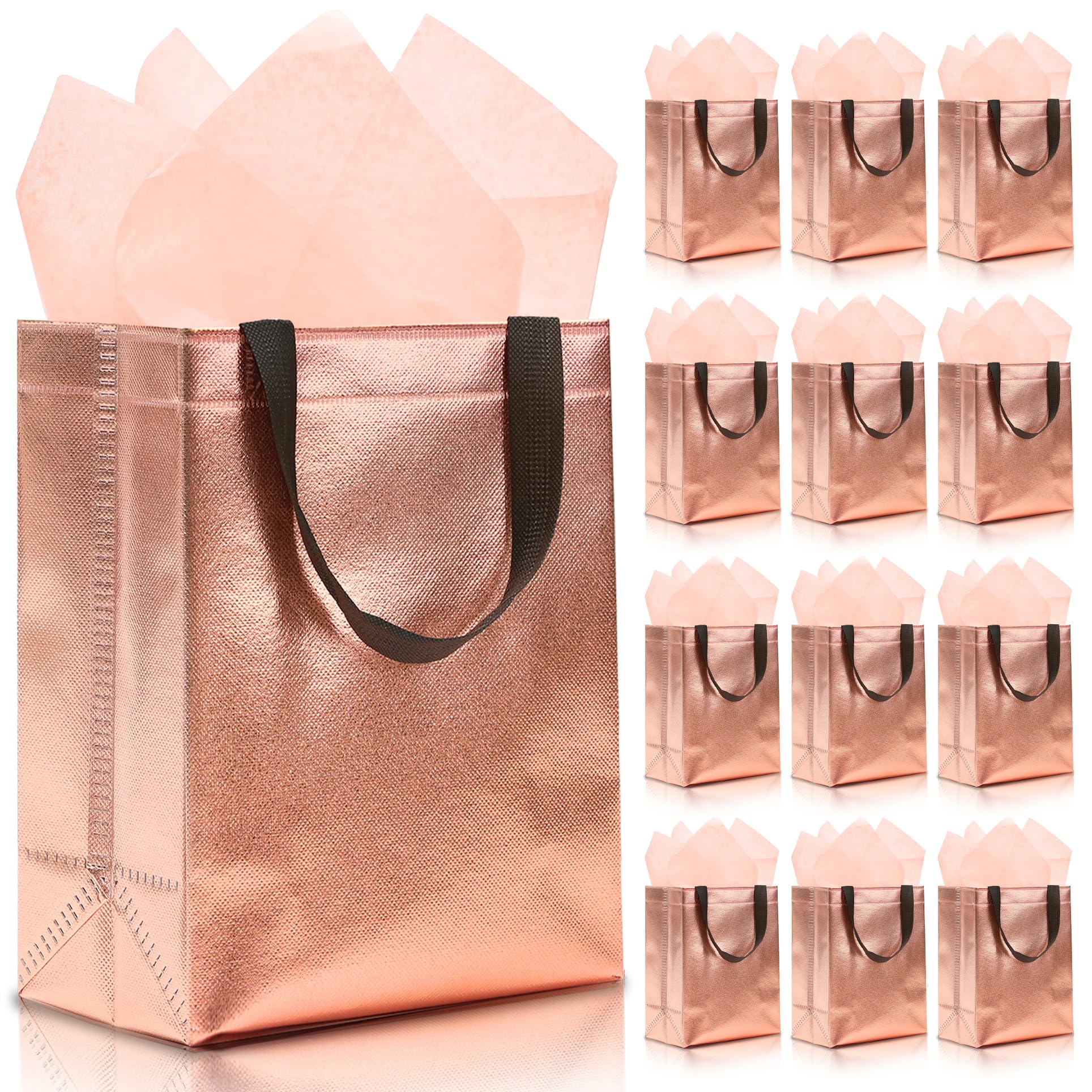 【Light, Foldable & Ready for Any Occasion】Our 12 reusable gift bags with handles are lightweight and foldable for easy storage without taking up space. These shiny rose gold gift bags are perfect for any event such as a birthday, wedding, bachelor party, etc. Whether used as a gift bag, shopping bag or party gift bag, these versatile bags are designed to enhance the atmosphere of every occasion. 【Durable & Waterproof Design】Crafted from premium non-woven fabric with a special waterproof coating, these bags are tear-resistant and built to last. The heat-pressed handles are strong enough to carry heavy items, from snacks and drinks to small gifts and clothing. These sturdy bags won’t let you down, ensuring your gifts are presented beautifully and securely every time 【 Reinforced Base for Stability】Each bag includes a cardboard insert to reinforce the base, keeping the bags upright and maintaining their stylish tote shape. No more worries about your bags bending or collapsing! This design detail ensures a polished look, making them ideal for retail and merchandise use, as well as everyday gifting needs 【Complete Set with Tissue & Cardboard Inserts】This set includes 12 sparkling gift bags, 12 sheets of tissue paper, and 12 sturdy cardboard inserts. Everything you need to create a beautiful gift presentation in one package! Whether you’re gifting at a wedding, baby shower, or birthday, these iridescent bags make your gift stand out, turning any moment into a memorable one 【Sustainable Use】 Our reusable medium gift bags are not only stylish, they're also good for the planet. These bags are made from recycled non-woven materials and are an upgraded alternative to traditional paper gift bags. Their durable, waterproof construction means they can be used over and over again, helping you cut down on waste while keeping your gift looking chic Elevate your gifting with KeerxunBag’s 12-pack rose gold gift bags. Crafted from premium laminated non-woven fabric, these bags feature a radiant metallic finish that shines under light, perfect for birthdays, anniversaries, or holidays like Christmas and Mother’s Day. Each 10x4x8-inch bag includes a rigid bottom card for stability and rose gold tissue paper to protect delicate items like wine glasses, perfumes, or tech gadgets. Designed to hold common gifts (candles, books, cosmetics), these reusable bags combine elegance with practicality.