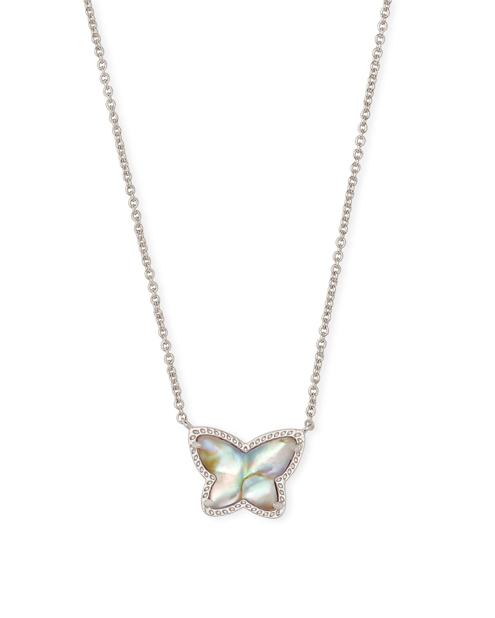 The Lillia Butterfly Pendant Necklace is the perfect pop of color to your next layered look. Details: This necklace measures 15" L chain with 3" extender, 0.67" L x 0.47" W pendant, lobster clasp. Gift Box & Jewelry Bag: Your Kendra Scott Jewelry will arrive pre-packaged in a genuine branded gift box and jewelry bag. This pendant makes a perfect gift for Valentine’s Day, Christmas, your wedding anniversary, Mother’s Day and birthdays. How to Care for Your Kendra Scott Jewelry: To protect the plating, remove your jewelry prior to hand washing, swimming, exercising, cleaning, and before applying any kind personal body products. Maintain your jewelry’s high shine by avoiding contact with soap, perfume, lotion, makeup, hair & cleaning products. The prettiest pastels pair with a symbol of transformation, growth, and hope.The Lillia Butterfly Silver-Plated Pendant Necklace in Iridescent Abalone is the perfect pop of color to your next layered look