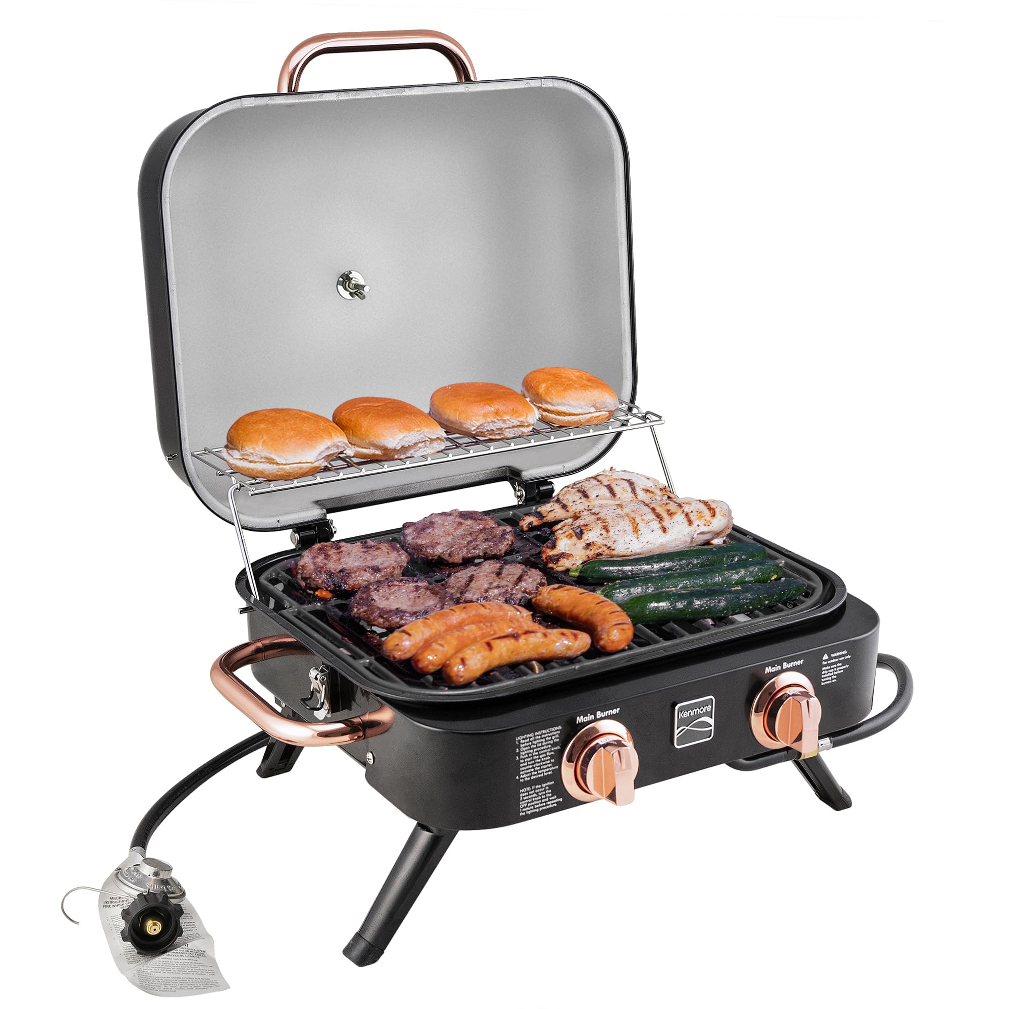 Kenmore 2-Burner Portable Gas Grill, Tabletop BBQ Grill with Warming Rack, Foldable Legs, Stainless Steel Burners, Fits 5 & 20 lb Propane Tanks, Ideal