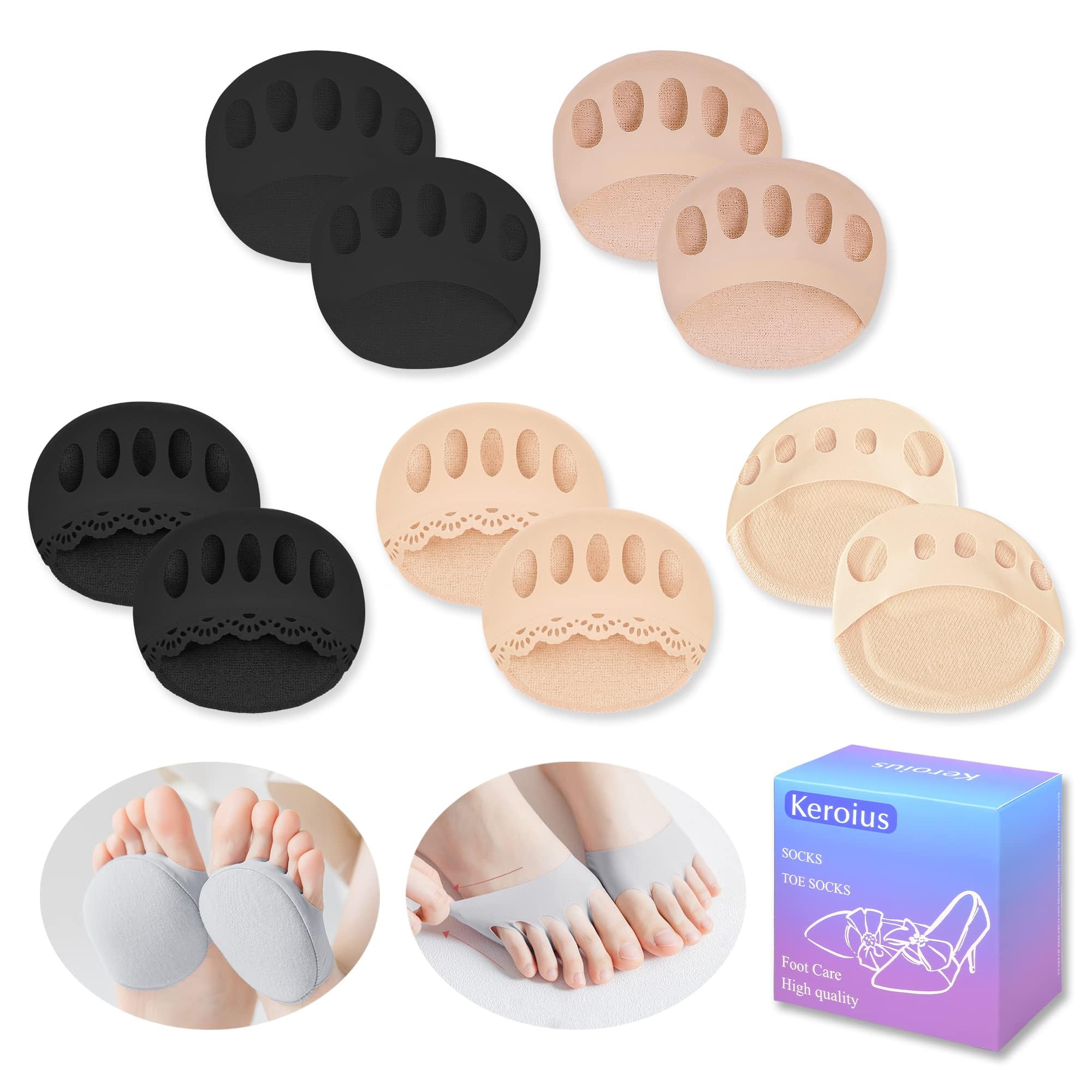 【Quality Material】Forefoot pads are made of an elastic, lightweight knit fabric,cotton and sponge, reliable across the entire ball of your foot, by long periods of standing or rubbing for better all-day comfort, suitable for both men and women. 【Half Toe & Five Toe Design】Toe Topper Liner Socks separate each toe and keep them dry and comfortable inside the shoe. It makes our toes healthy. In addition, the half-toe design can make the toes more free and breathable. 【Pain Relief】Metatarsalgia dancer pads designed to reduce the friction between the sole of the foot and the shoe, and effectively prevent slippage; and the material is very soft, elastic and breathable, effectively improving the cushioning force of the forefoot and dispersing pressure. 【Breathable and Elastic】Soft and comfortable cotton honeycomb fabric front foot pad, unique hole design, can form unique pores on the footpad, let air circulate freely. Metatarsal forefoot pads fit for most people's feet; They can easily absorb sweat and keep the feet clean and dry. 【Size & Suggestion】One size fits 6-9.5 size for women. We suggest you use them inside the looser fitting shoes to avoid causing your feet discomfort due to squeezing. Keroius Forefoot Cushion Pads,Toe Topper Liner Socks