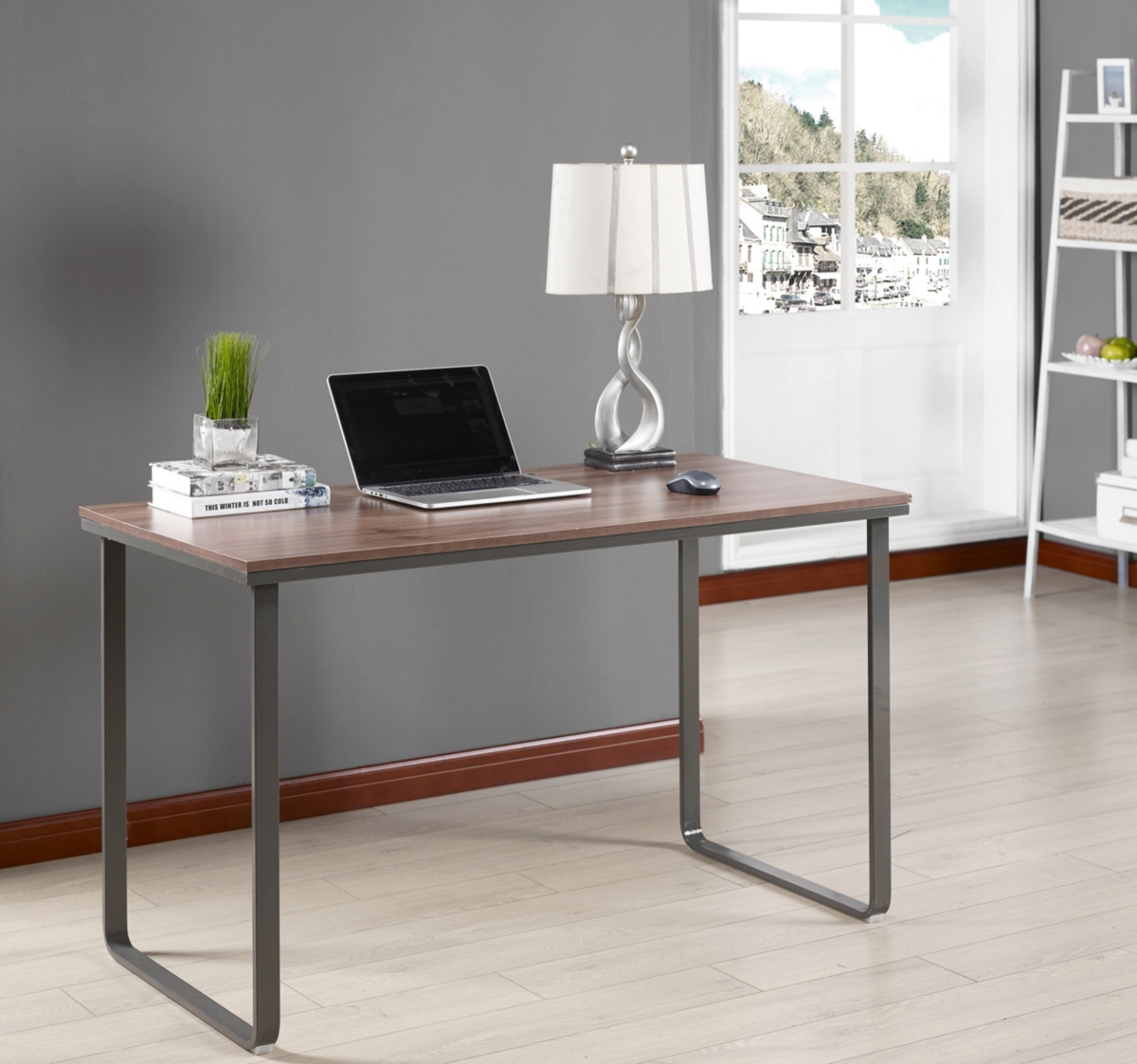 Give your space a sleek, polished appearance with this desk. Constructed with a strong grey metal frame and a brown wooden surface, the Wallace desk features a minimal aesthetic that works well in modern spaces.