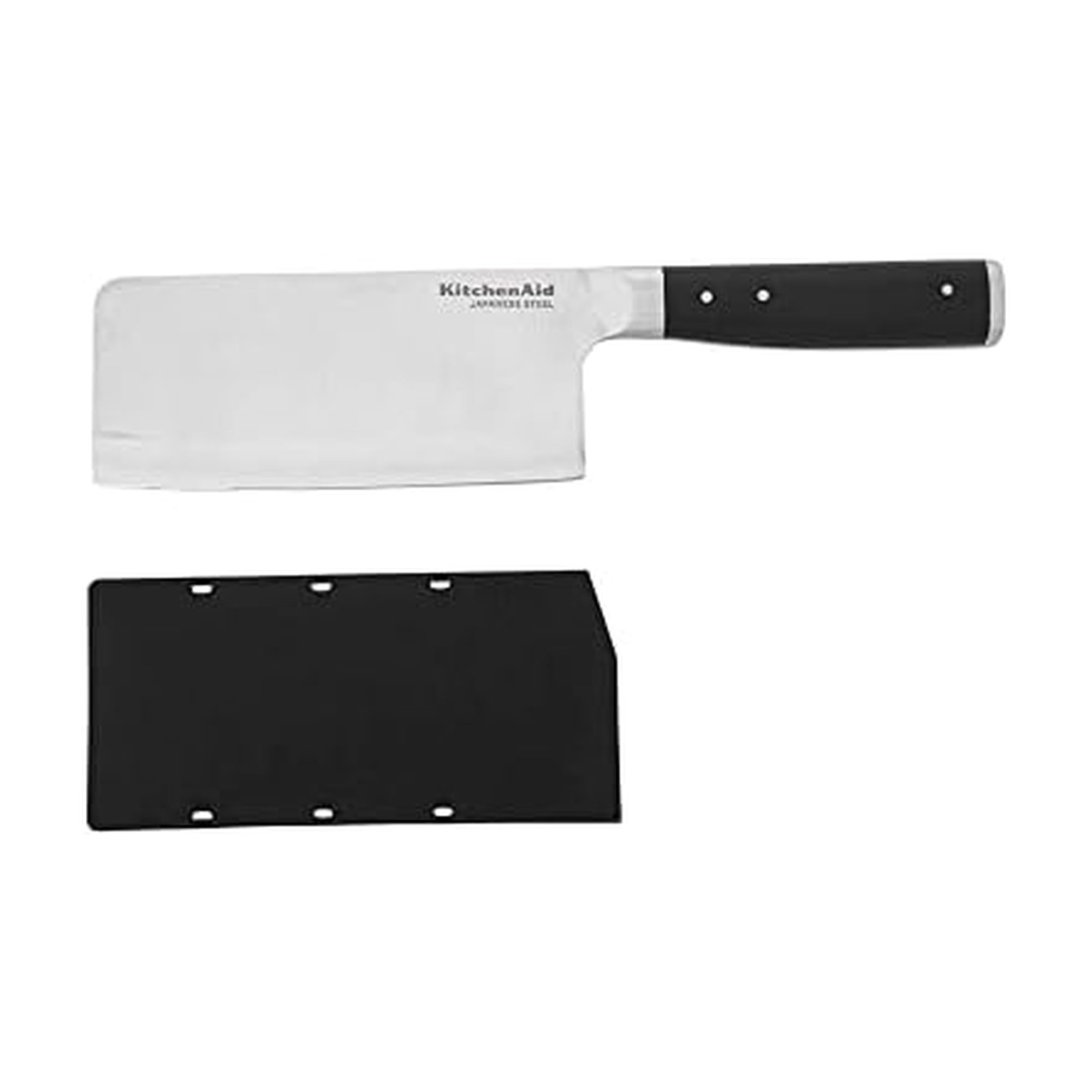 CUTLERY ESSENTIAL: The KitchenAid cleaver is designed to easily carve through tough or tender meat and dense vegetables with one downward stroke. The perfect knife for prepping any meal, from steaks to stews. LONG-LASTING SHARPNESS: Forged knives are expertly crafted using semi-polished, high-carbon imported Japanese steel, hardened and tempered to provide a long-lasting edge for a professional, quality cut every time. ERGONOMIC HANDLE: Constructed for perfect stability and control, the eastern-style ergonomic handles are well-balanced and feature a triple-riveted construction for a secure, comfortable grip. BLADE COVER: Includes a custom-fit blade cover for secure, safe storage. EASY CARE: KitchenAid knives are top rack dishwasher safe. To extend the life of your cutlery, hand washing is recommended. Dry immediately.