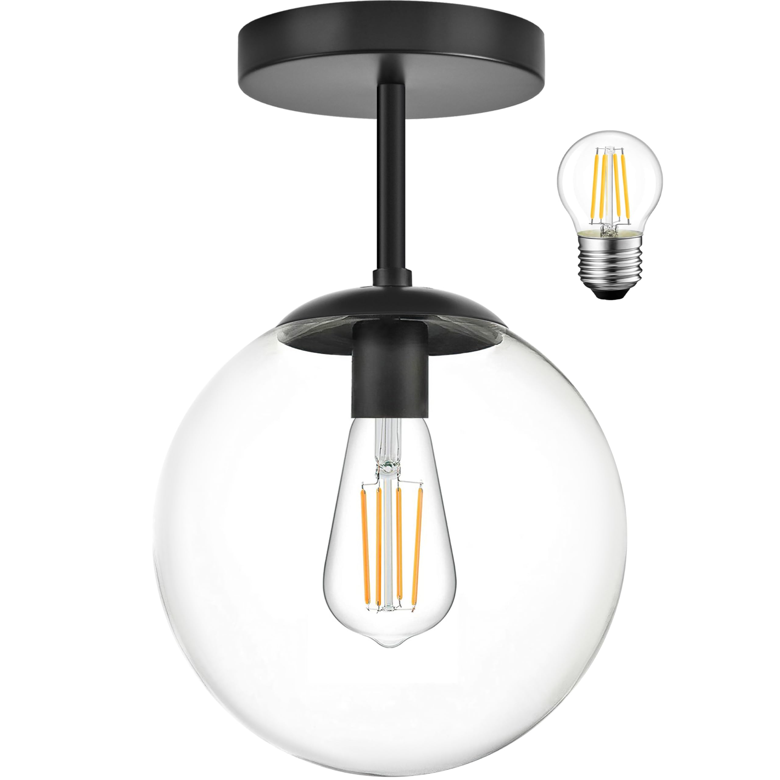 [Size &Package] D6" (15CM) x H11" (28CM), the size of canopy is D4.7" (12CM). Bulbs Included 4W 2700k warm light color, voltage 110-220V. [Bulb] Bulb base: E26. Works with incandescent, LED, CFL, halogen and color changing bulb. Fully dimmable when used with a dimmable bulb and compatible dimmer switch (both not included) [Classic Design] : Mid Century Modern, retro, vintage, antique, industrial, cottage. With globe shade semi-flush mounted close to the ceiling, Clear Glass with black Finish. The mcm Globe Ceiling Light delivers a classic look to your home. Especially for Hallway Aisle Porch Stairway Closet Kitchen Laundry Room. [Quick & Easy Installation:] This flush mount ceiling light is hardwired, installation required. 90% Assembled. Save your time. [After-sales service]: If you buy our products encountered after the problem can not be resolved, please inform us in a timely manner, we will answer your questions as soon as possible, to provide you with a satisfactory solution!