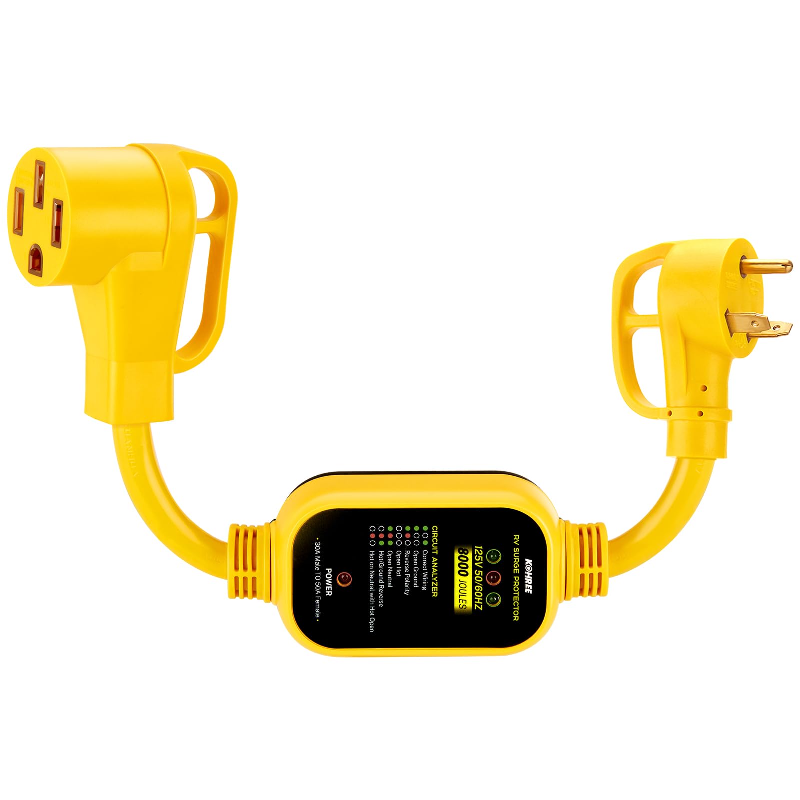 【30AMP TO 50AMP RV ADAPTER】30 Amp NEMA (TT-30P) male to 50 Amp NEMA (14-50R) female adapter for convenient power connection to your 50 Amp RV at the campground. 【8000 JOULES SURGE PROTECTION FOR RV】Kohree 30/50 amp surge protector for camper absorbs high voltage spikes within 1 ns. It safeguards your RV's electrical gear against hazardous voltage fluctuations, electrical disruptions, and abrupt power spikes resulting from thunderstorms. 【CIRCUIT ANALYZER WITH LED INDICATORS】Effective way to verify whether the power source is wired correctly and to detect most wiring faults. Diagnostic LEDs on trailer surge protector provide fault indication: Correct Wiring, Open Ground, Reverse Polarity, Open Hot, Open Neutral, Hot/Ground Reverse, Hot on Neutral with Hot Open. 【EASY & SAFE TO USE】The RV power adapter plug is designed with an ergonomic grip handle for safe and effortless plugging and unplugging. 【HIGH QUALITY MATERIALS】Made up of high quality pure copper and heavy duty PVC, Kohree 30 amp to 50 amp RV adapter is fireproof, high-temperature resistant and identifies faulty power, ensuring RVs, campers' safety. Kohree 30 Amp to 50 Amp RV Adapter, 8000 Joules Electrical Power Adapter with Surge Protector