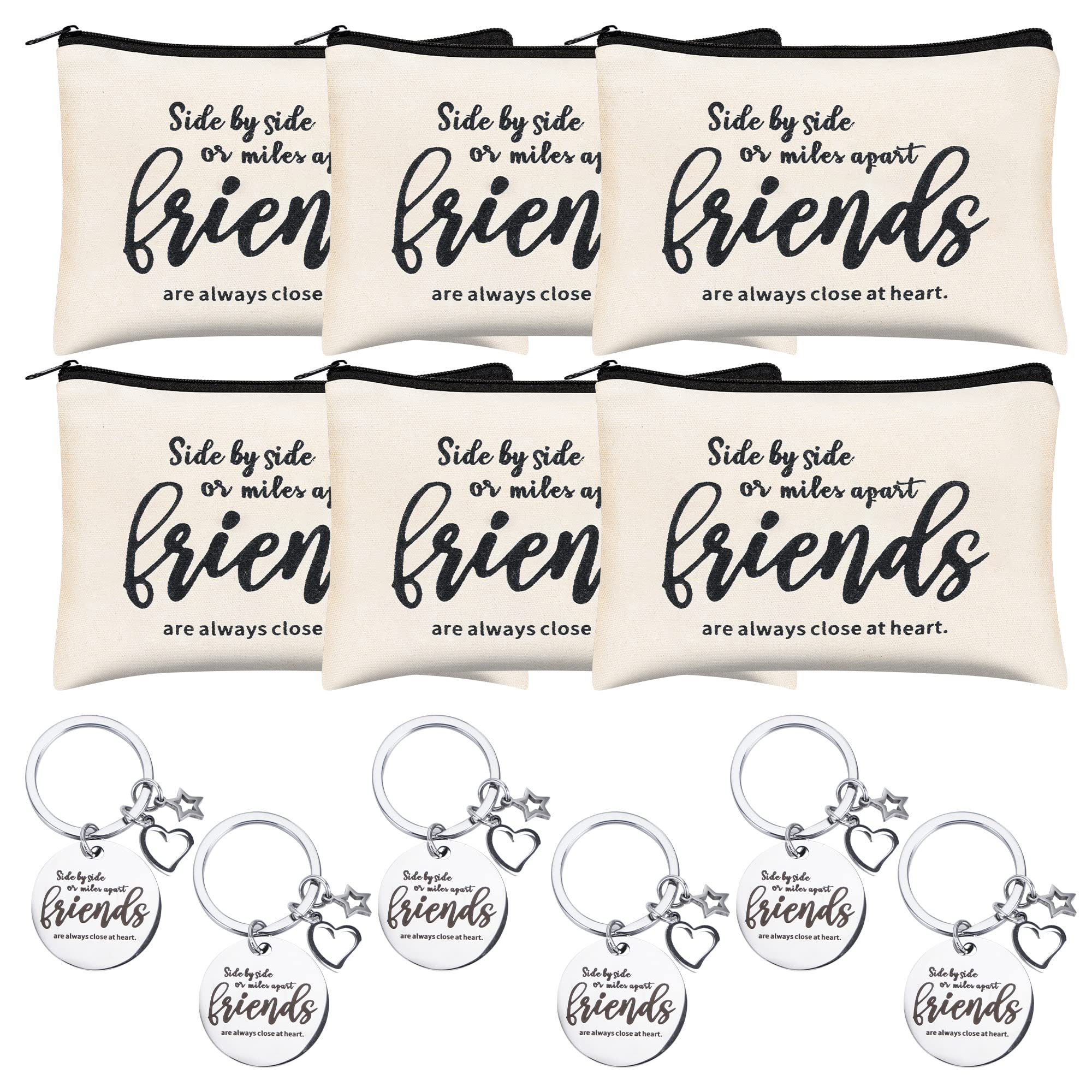 Friend appreciate gift set: you will receive 6 pieces friend makeup bags and 6 pieces friend keychains, 12 pieces in total, which are nice combinations for you to prepare for your friends,women friends, long distance friend, bestie,nice and considerate Friend Makeup Pouch : each bag size is 23.5 x 15 cm/ 9.3 x 5.9 inches, printed with the words which expressing your respect and love for your friend ,made of high quality polyester cotton, he quality zipper design makes it safe to secure the inner items Delicate keychains style: these friend keychains are made of stainless steel, durable and adorable, they are also engraved with some words about friends, the nice pendants look elegant and cute, which can decorate your bag and other objects easily Delicate friend gift choice: this cosmetic bag is colorfully printed with thoughtful words, making it a way to remind them that even if you're far away you'll always have each other; you can send these friends zipper pouches to your good friends, best friends, intimate friends, sisters, roommates, classmates and more on birthday, graduation seasons, Christmas and Thanksgiving Day, which is also a good way to increase your relationships Wide application: can as a meaningful gift to all of your friends, or those family, in Christmas, birthday, thank you, housewarming, wedding, remembrance gift, girls weekend, holiday, miss you gift, stocking stuffer, graduation, Thanksgiving, Valentine's Day, etc.THIS ITEM IS NOT INTENDED FOR USE BY CHILDREN 12 AND UNDER. Friend appreciate gift set: you will receive 6 pieces friend makeup bags and 6 pieces friend keychains, 12 pieces in total, which are nice combinations for you to prepare for your friends,women friends, long distance friend, bestie,nice and considerate