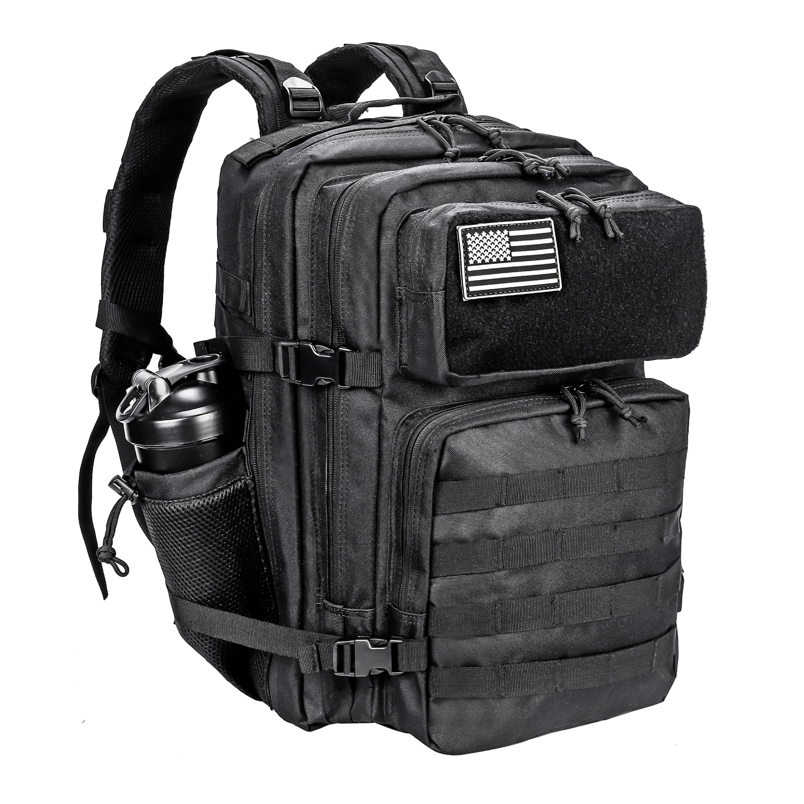 1. Military Tactical backpack size approx: 12inch x 20inch x 12inch, Capacity: 45L; Military backpack is made of 900 oxford nylon fabric, durable and water-resistant. Suitable for fitness, travel, hiking, camping, and other outdoor activities. 2. Assault pack backpack with double-stitched, Heavy duty zippers and utility-style cord pulls, Side and front load compression system, Ventilated mesh padded back area & shoulder strap, breathable and comfortable. 3. Tactical backpack has molle system, Plenty of mount points on the outside of tactical backpack for add-on pouches, designed to be used in combination with other equipment, you can load pockets, water bottle bag, accessory kits and other. 4. This tactical backpack has multiple compartments and zip closure pockets, including interior zip pockets and mesh pockets, bottle holder on the side holds 750ml water bottles, it allows you to put almost all necessities inside, perfect for outdoor activities and military hobbies also cool for fashion lovers! 5. This tactical assault backpack can be used as a 3-day assault pack, bug-out bag backpack, army backpack, hunting backpack, military survival backpack, trekking backpack, or day pack for daily use.