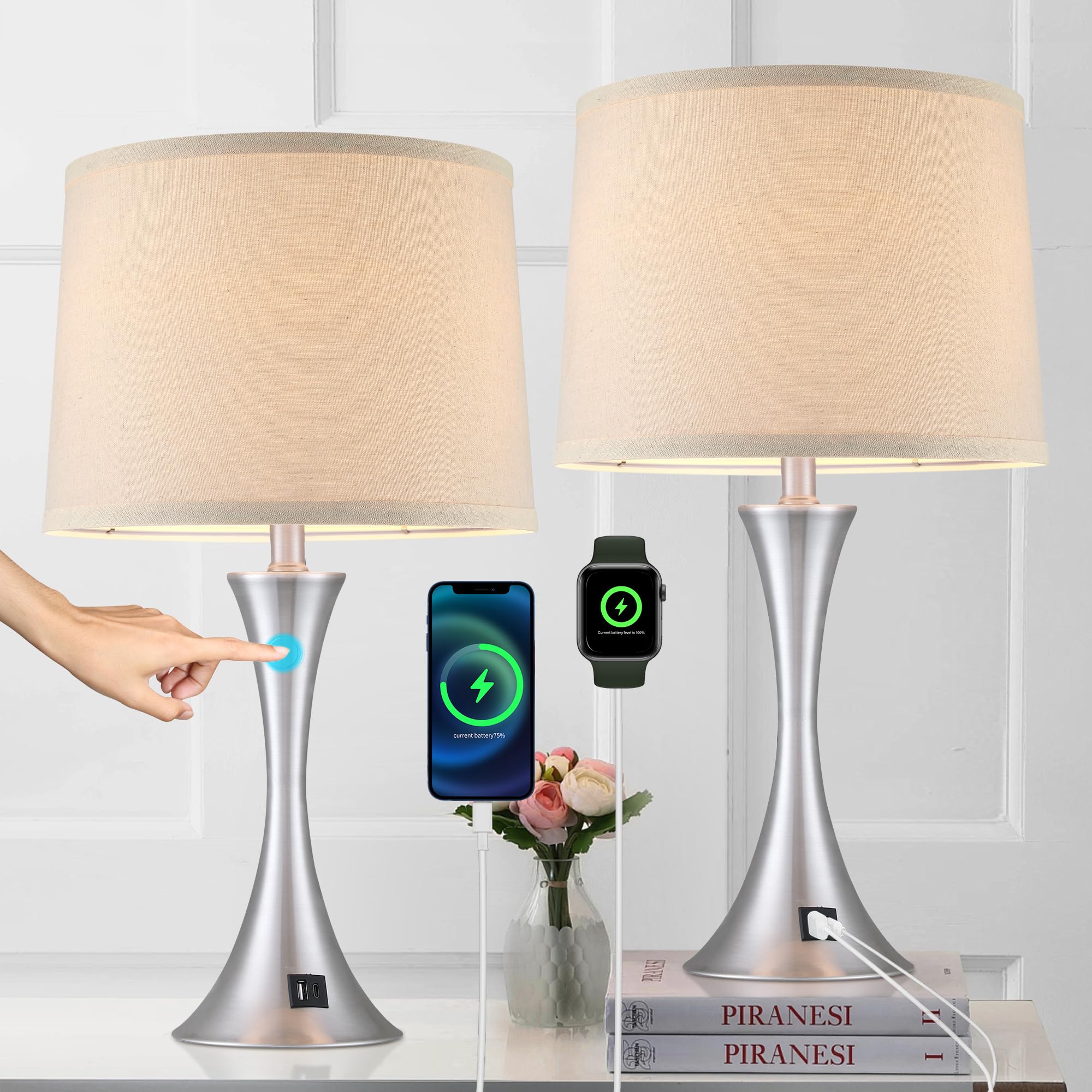 3 WAY DIMMABLE TOUCH CONTROL: Our table lamps enables you to smoothly control 3 brightness options (low, medium, and high) by simply touching any position on the lamp body to meet your different needs. Suggest dimmable bulbs to match 3-way dimmable function of the table lamp. It help you get rid of the hassle of fumbling for switch in the dark, perfect for nightstand, nursery, kids room and study room. CONVENIENT USB CHARGING PORT: The beside table lamp equipped with USB C+A(5V/2.1A) charging ports, easily and quickly charge 2 devices at the same time. Whether the lamp is on or off, you can charge your phone, tablet, watch and other electronic. Fully save your space and time. STRONG METAL MADE: The modern nightstand lamp is made of metal body and classic styling. The nickel color desk lamp using electroplating treatment, it look smooth and texture. As for the base, there is an anti-slip and mute pads on the bottom of the base, reducing friction and noise when you move that office table lamp as well. PERFECT SIZE: The nickel lamp table is 21.5'' high overall with 5.6'' wide base. This desk lamp is equipped with 1.5 meter-long (59 inchs) transparent power cord and US standard plug for convenient use. With E26 standard base (suggest use dimmable bulbs, bulb not included), this classic table lamp is perfect for living room, college dorm,dining room, coffee table or office and so on. This night stand lights is also a great present for your family and friend. WIDE APPLICATION: LIT-PaTH modern design table lamp kits is suitable for various occasions, such as bedrooms, living rooms, nightstand, dresser and end table. It also can be used as a bedside lamp, reading lamp, children's table lamp, night light, desk lamp, touch lamp, bedroom lamp or table lamp. LIT-PaTH Table Lamp for Bedroom Nightstand Set of 2, Bedside Lamps with 3 Way Dimmable Touch Control and USB C+A Charging Ports, Linen Shade Desk Lamp for Living Room, Nickel (LED Bulb Not Included)