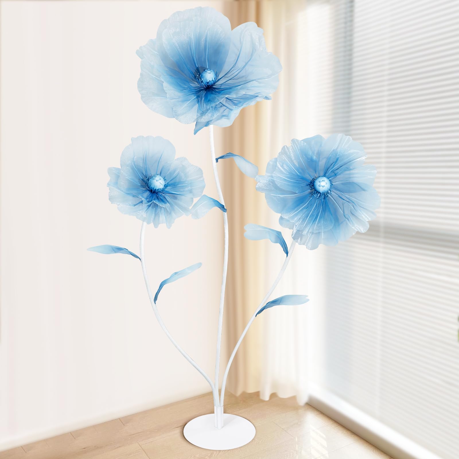 Giant Flower Size: You will receive 3pcs artificial flowers, equipped with a metal base and fixing nuts. The maximum vertical height is about 5.9 ft, and the flower head diameter is 31.4/23.6/15.7 inches