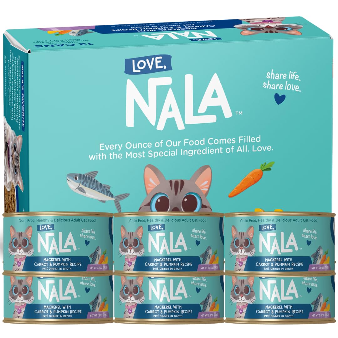 REINFORCES A BALANCED NUTRITIONAL DIET: We’ve meticulously crafted a formula designed to provide a harmonious blend of vital nutrients, including essential vitamins, minerals, taurine and omega 3. These organic nutrients support your cat’s immune system, heart health, eye health, & overall well-being PREMIUM QUALITY PROTEIN SOURCE: LOVE, NALA takes pride in using only natural high-quality lean protein as the primary ingredient, providing the essential amino acids for your cat's muscle growth, vitality, & happiness. All our food is topped with our secret ingredient: a pinch of love. GRAIN FREE & NON-GMO: Our pate mackerel, carrot, & pumpkin is prepared without any grains, artificial additives, or by-products, as our goal is to feed cats the way nature intended. We always source wholesome ingredients to promote optimal health and nutrition. SUPPORTS DIGESTIVE HEALTH & ENSURES HYDRATION: Our prebiotic fiber blend helps your cat’s digestive health, while our thick seafood broth helps hydrate your cat to protect kidney function. This fiber and water combo promotes nutrient & electrolyte absorption and an easily organic digestible meal for your feline companion. TRUSTED BY CAT OWNERS & VETERINARIANS: We have customers who trust our brand to provide a healthy complete meal for their indoor and outdoor cats that enhances their longevity and physical fitness. Veterinarian’s also recommend our wet food to help support daily nutritional goals of cats of all ages. Introducing our grain-free, natural canned cat food pate - a delicious and nutritious meal for your feline companion! Every ounce of our cat food wet pate is filled with wholesome, healthy, nutritious ingredients, as well as the most special ingredient of all: love. Because love makes all the difference in the world. Our grain-free canned cat food comes in a convenient, easy-to-scoop texture that your feline friend will love. The pate is also great for mixing in with dry cat food or using as a topper for added flavor and nutrition. Plus, the canned packaging makes it easy to portion out and serve at meal times. Our pate cat food wet is made with high-quality protein to help support lean muscle growth and a fiber blend to help support digestive health. It also contains taurine for heart and eye support and is free of artificial preservatives, flavors, and colors. Additionally, our cat food contains no grains, fillers, or by-product meals. Spread the love with this decadently delightful, edible, spreadable bit of purrrfection. Grain free cat food wet mackerel blended with pumpkin puree and fresh sweet carrots. This soft cat food pack includes 12 cans of delicious, nutritious mackerel with carrot and pumpkin recipe cat wet food pate, perfect for keeping your feline friend well-fed.