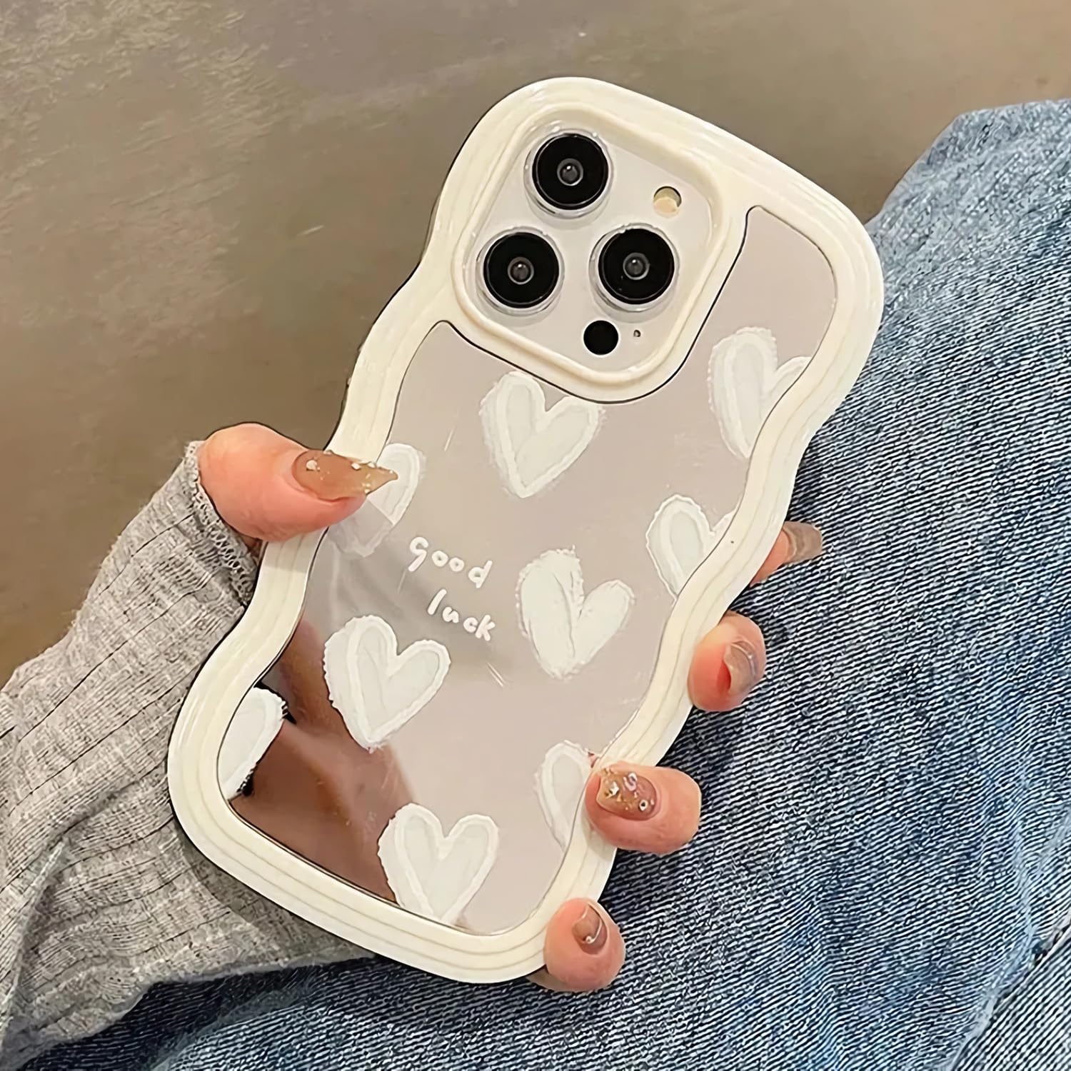 Fits Your iPhone Perfectly: This phone case is specifically designed for the iPhone 15 Pro Aesthetics: The cute love hearts pattern design makes your phone more fashionable, and unique mirror back is convenient for you to check makeup and touch up makeup anytime & anywhere Protection: The TPU materials can reduce the impact of the phone falling, combine with raised edges around the screen and camera offer extra protection against scratches and drops Comfortable grip: This case has a nice and firm grip that feels secure in hand; the frame of the case is smooth wave line, so it can better fit the palm and feel comfortable to hold Easy Access: Precise cutouts and easy-press buttons ensure that using the phone remains a seamless experience without compromising on protection This iPhone 15 Pro Case is made of high-quality TPU and PC materials, which is soft and durable, and has a good hand feeling. The iPhone 15 Pro Case has a unique design, which is made of a white hearts pattern, curly wave frame, soft cute love heart design, and is suitable for women and girls. The iPhone 15 Pro Case has a raised bezel camera design, which can effectively protect the phone's camera from scratches and drops. The iPhone 15 Pro Case has a raised corner design, which can effectively protect the phone's screen from scratches and drops. The iPhone 15 Pro Case has a smooth surface, which can effectively reduce fingerprints and smudges. The iPhone 15 Pro Case is easy to install and remove, and is compatible with most wireless charging pads.