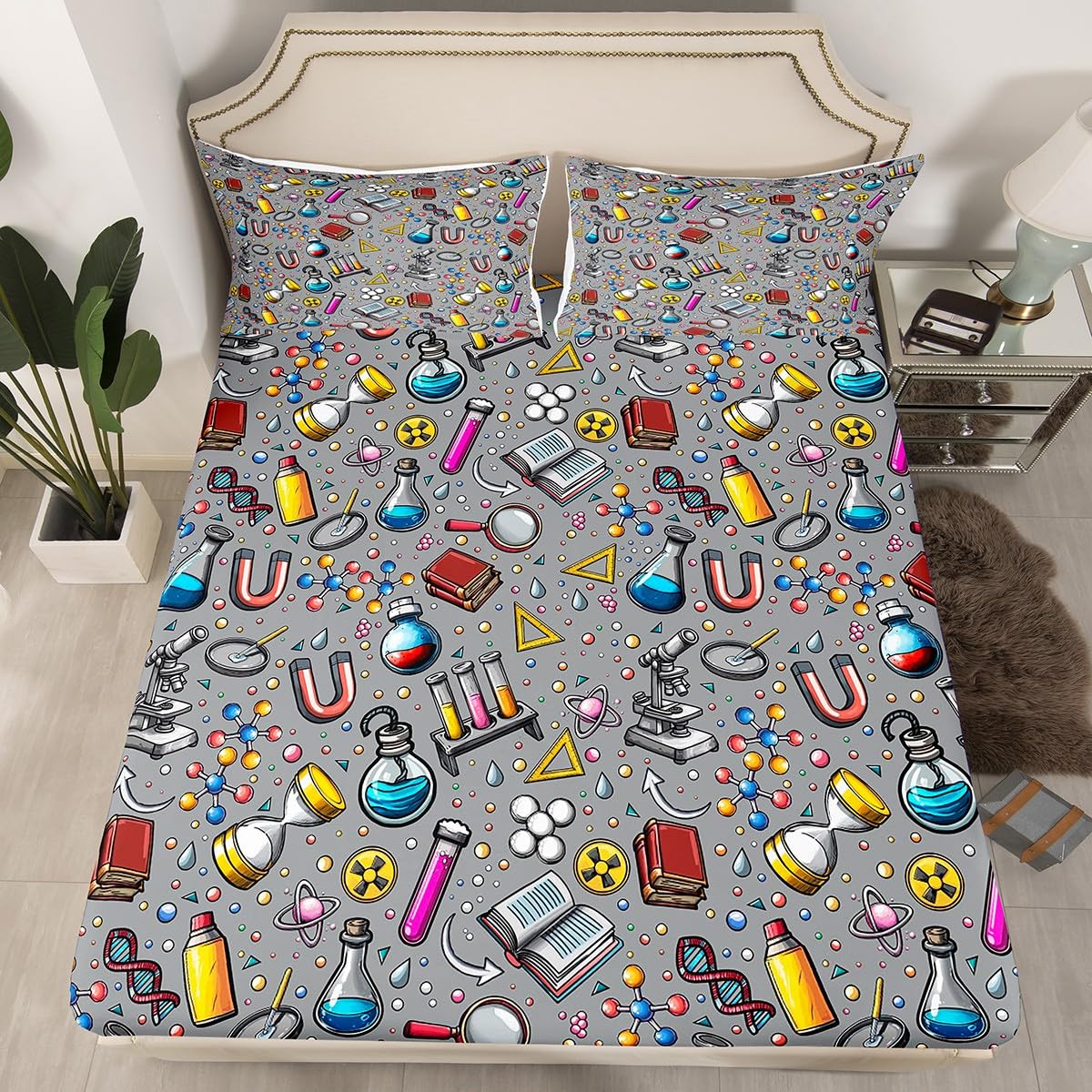 Laboratory Bedding Set Chemistry Lab Bed Cover for Kids Teen Boys Young Man Test Tube Microscope School Graffiti Fitted Sheet Chemical Elements