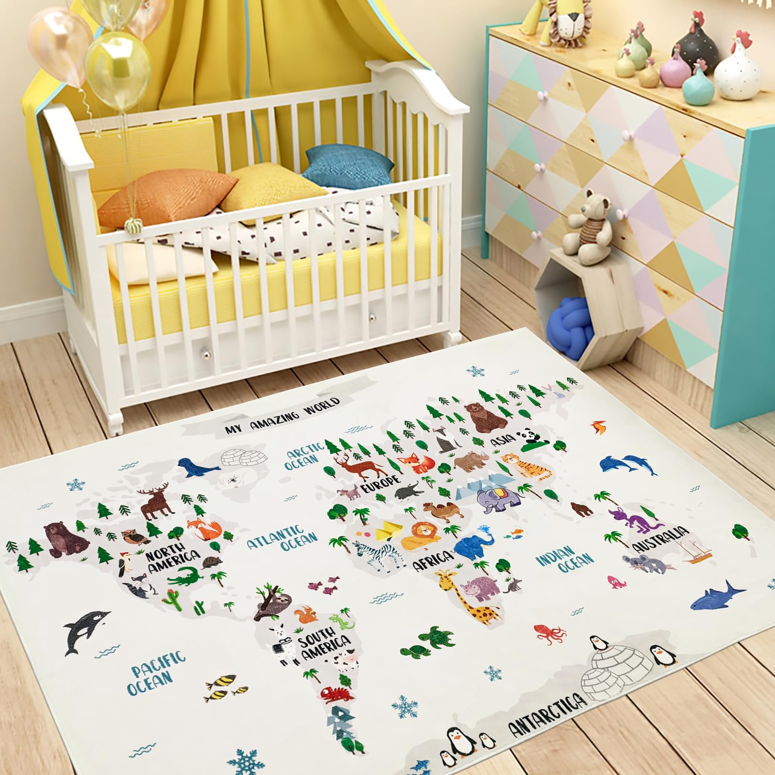World Map Rug Size and Material: This kids play mat measures 47"x71" (120cmx180cm), suitable for kids play room, nursery, bedroom and living room; Made of polyester fiber, the surface of this 4X6ft cute animal play rug for kids is ultra soft, cuddly, durable and skin friendly; With the latex backing, this kids nursery rug is nonslip, not easy to move, easy to FOLD AND WASH Soft Learning and Educational Area Rug: The animal design of this world map rug for kids will bring lots of fun if your little ones love animals; This world adventure kids carpet can help to enhance kids’ recognition, thinking and imaginative skills; Kids can spend their story or play time on this cartoon animal continent map bedroom rug; It’s truly a great fun for children and parents! Cute Design for Kids Room Decor: This medium pile playroom rug for girls and boys is designed with world map and cute cartoon patterns, very very attractive to kids; Rich elements and colors of this faux wool area rug also make kids room a lovely space; This nonskid, easy foldable and washable kids rug is truly a great choice for kids room decor and nursery decor Versatile: This washable jungle animal and map floor mat is a great choice for kids playroom, bedroom, living room, nursery room, daycare center, kindergarten or childcare center as a play mat, bedside rug, crawling mat, classroom rug, dorm rug, sitting carpet or even a sleeping rug; It’s also a great Christmas, birthday or daily gift, and baby shower gift Easy to Clean: Vacuum regularly, Hand or machine wash in cold water, Tumble dry low or hang dry, Avoid long time soaking and high temperature, Wash separately and do not bleach; WARM TIPS: The color may be varied due to light and monitor reason, and please refer to the actual color Lacomfy has always been committed to providing our customers with high quality products to ensure the feeling and experience of our customers, and is constantly improving our services for this purpose.