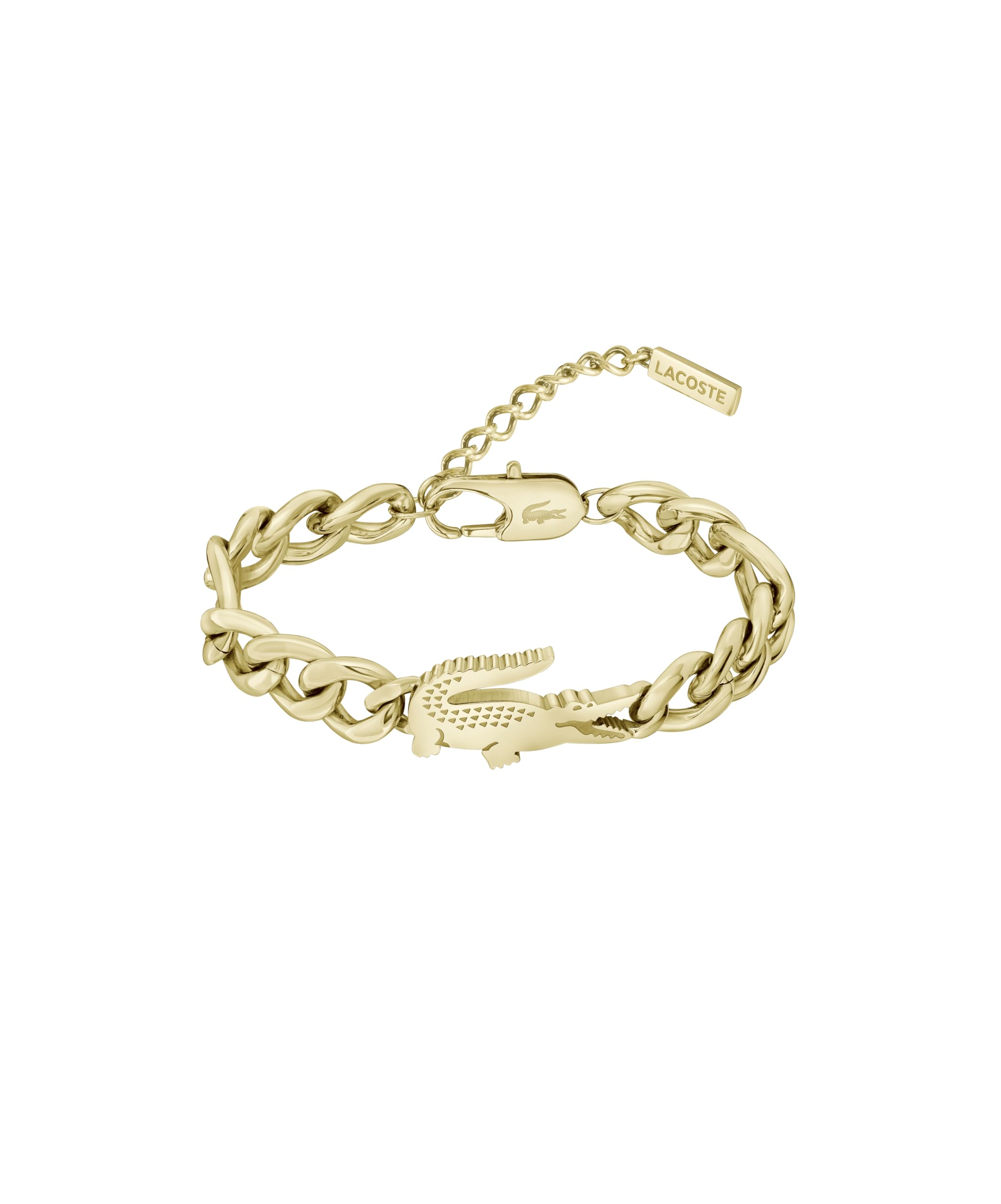 The Lacoste Crocodile bracelet features a bold figaro chain with a 15mm-wide etched crocodile centerpiece. Stylish and urban-inspired, it’s perfect for making a statement with the brand's iconic design. Great Fit: Measurements Inner Circumference 190mm 25mm - Crocodile 285 X 35mm. Style and Ease: Featuring a carabiner clasp for a strong and secure closure. For Countless Occasions: Working, shopping, travel, vacation, holidays, etc. How To Care: To protect the plating, remove your jewelry prior to hand washing, swimming, exercising, cleaning, and before applying any kind personal body products. Maintain your jewelry’s high shine by avoiding contact with soap, perfume, lotion, makeup, hair & cleaning products.