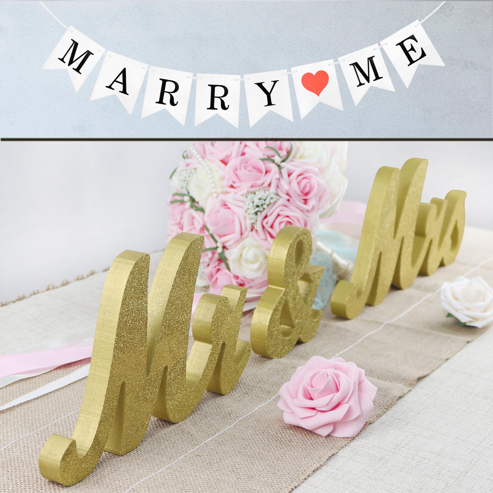 Large Golden Mr & Mrs Sign for Wedding Table with Marry Me Banner for Proposal Arrangement- Gold Glitter Freestanding Letter Decorations for Party or