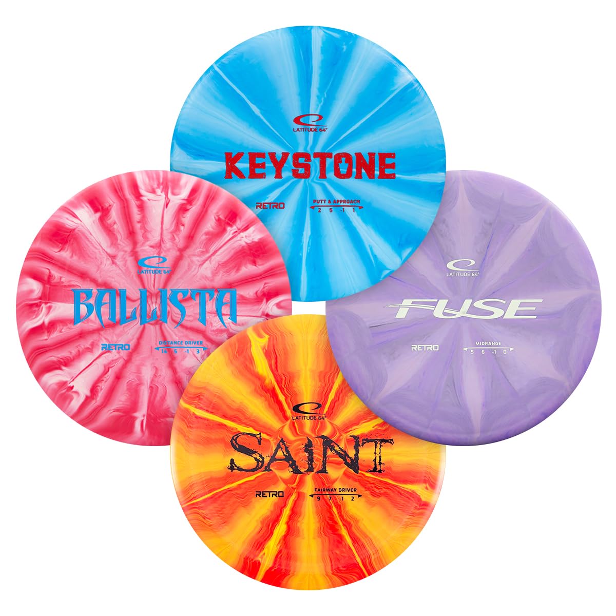 PERFECT FOR NEWER TO INTERMEDIATE PLAYERS - This disc golf set is the perfect choice for new players or intermediates that have been playing for a while and have some experience with the game. All discs come in a base plastic that allows them to have an easier flight that will slowly beat in over time to fly more understable DISCS INCLUDED - Included in this disk golf discs set is the Keystone (2, 5, -1, 1), a straight flying putter with high glide, the Fuse (5, 6, -1, 0), an understable midrange with effortless turn, the Saint (9, 7, -1, 2), a higher speed fairway driver for controlled drives, and the Ballista (14, 5, -1, 3), an overstable driver for max distance shots. ABOUT RETRO BURST PLASTIC - Retro Burst is Latitude 64’s baseline plastic and has an incredible feel and excellent grip in any weather conditions. These are affordable discs with an aesthetic burst effect that are perfect for beginners looking to try out the sport. Discs in Retro plastic are firm and will beat in faster over time compared to more premium discs, and will work into that amazing more understable discs flight path TRUSTED BRAND - Latitude 64 is known for its dedication to quality and performance in the disc golf world. As a leading manufacturer, they’ve crafted discs that are trusted by professionals and recreational players alike. With a focus on precision, innovation, and customer satisfaction DISC WEIGHTS & COLORS - All the discs in these disc golf beginner sets will come within the weight range of 170-176g. Please note that when you purchase this set that the color of the disc and stamp will vary The Latitude 64 Disc Golf Starter Set has 4 of the most popular Latitude 64 molds included! This box has everything that you need to get started in disc golf: one maximum distance driver, one fairway driver, one midrange, and one putter. Discs are all Retro Burst Plastic. Disc golf does not require any previous experience or skills, and anyone can improve quickly with practice. So take these discs and get out, get active, and play disc golf. Disc Color and Stamp Color Will Vary. discs for disc golfing,frisby golf disc set,disc golf starter sets,discs for disc golf,disc golf starter kits,frisby golf set,disc golf sets,disk golf set,discgolf,disk golf starter set,disc for disc golf,disc golf equipment,frisby golf,disc golf putter,disc golf driver,disc golf mid range discs,disc golf putters,disc golf drivers,disc gold,disc golf flying discs,disk golf accessories,disk golf driver,driver disc golf,latitude 64 fuse,disc golf accessories for men,latitude 64 discs,latitude 64 river,latitude 64 saint,river disc golf,retro disc,flying disc sports equipment,disc golf discs driver,disc golf gifts for men,disc golf midrange,disc golf midranges,disc golf gear,disc golf stuff,disk golf gifts,gifts for disc golfers,disc golf gifts for him