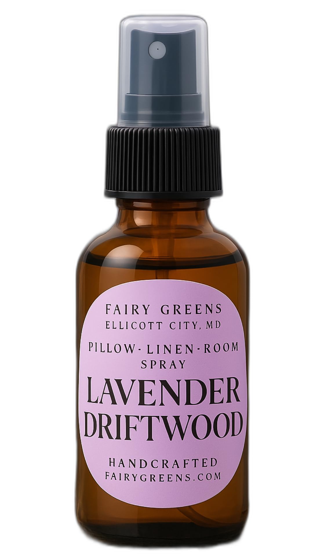 SOOTHING AROMATHERAPY FOR BETTER SLEEP: Enjoy the calming effects of our Lavender Driftwood Pillow Spray, crafted with pure essential oils to help you relax and enjoy better sleep. This gentle lavender sleep spray reduces stress and promotes restful sleep, creating a peaceful bedtime routine with just a few sprays. VERSATILE SPRAY FOR LINEN, ROOM, AND PILLOW: Use our aromatherapy spray as a linen spray to refresh your bedding, a natural room spray to enhance any space, or a pillow spray to prepare your sleep environment. It’s a multi-purpose solution that brings the calming scent of lavender wherever you need it most. ALL-NATURAL SLEEP MIST FOR SAFE USE: Made with only essential oils, natural witch hazel, and distilled water, our lavender spray for sleeping is free from alcohol and synthetic chemicals. This creates a safe and gentle aromatherapy pillow spray that’s perfect for nightly use around the whole family, including children and pets. HANDCRAFTED ON A PLANET-LOVING FAMILY FARM: Proudly made on our Maryland lavender farm, our lavender pillow mist is handcrafted with care, reflecting our commitment to quality and our world. Support small-scale farming with our lavender pillow spray, and enjoy a product made with love and respect for nature. EASY TO USE AND TRAVEL-FRIENDLY DESIGN: To apply, hold the bottle upright 4 to 6 inches from your pillow, comforter, or bedsheet, and lightly spritz the desired amount. Our compact 2 oz amber bottle is perfect for travel, so you can sleep well anywhere without worrying about stains. Lose yourself in the calming power of nature with Fairy Greens Lavender Driftwood Pillow Spray. Handcrafted on our family farm in Maryland, this soothing spray is made with pure essential oils, natural witch hazel, and distilled water—nothing more. Designed to help you relax and achieve a restful night's sleep, our versatile lavender spray can be used as a pillow mist, linen spray, or natural room spray. Safe for use around children and pets, it’s the perfect addition to your nightly routine. Each bottle reflects our commitment to quality and planet-loving practices, for a product that not only enhances your sleep but also supports small, family-run farms. Enjoy a tranquil night’s rest with the gentle, stress-relieving scent of lavender. Your journey to better sleep starts here.