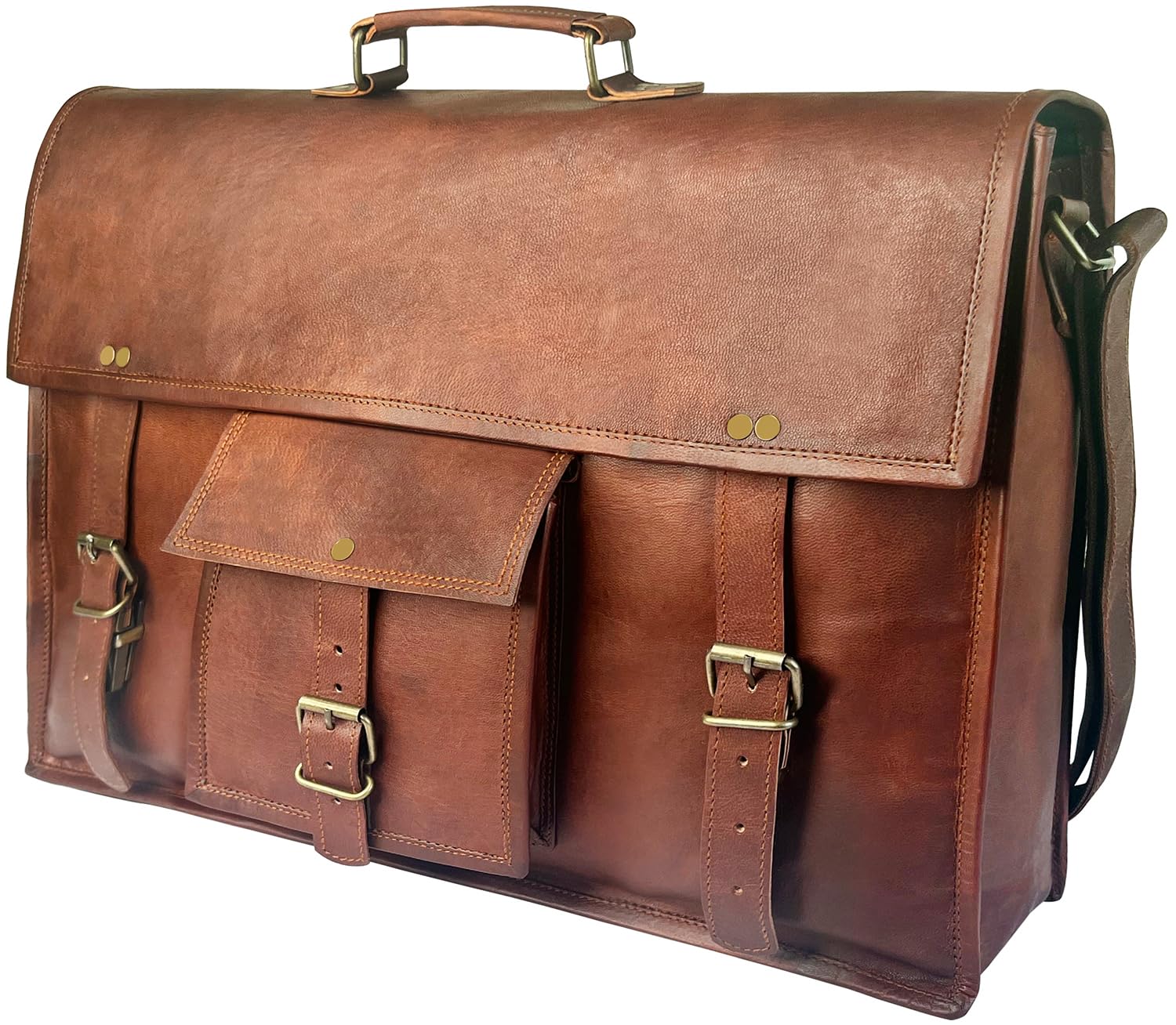 ✅ PREMIUM FULL GRAIN LEATHER: Experience unparalleled quality with our laptop bag crafted from full grain goat leather. Its rich, distressed finish offers a sophisticated rustic look that enhances with age, while exuding a delightful leather aroma. Expertly designed for durability, it promises to be a lasting companion in your professional journey. ✅ MASTERFUL ORGANIZATION: Measuring 18" x 12" x 5" (LxHxW), our briefcase features a specialized padded compartment that comfortably accommodates laptop up to 18 inches or a MacBook. It is further enhanced with a secure zipper pocket, exterior front and an additional back zipper pocket, ensuring your essentials are organized and within easy reach wherever your day takes you. ✅ SOPHISTICATED STYLE ON THE MOVE: Elevate your everyday look with our exquisitely designed leather bag. Whether you’re off to the office, traveling, or attending important meetings, this bag merges luxury with practicality, making it an essential accessory that complements your professional and personal wardrobe seamlessly. ✅ OPTIMAL COMFORT: Our messenger bag is designed with your comfort in mind. It features a long, shoulder strap measuring 55 inches for ease of carrying, and its ergonomic design ensures comfort during long commutes or trips. The convenient leather strap at the back allows for easy attachment to rolling luggage, facilitating a stress-free travel experience. 🎁 THE PERFECT GIFT FOR HIM: Show your appreciation with a gift that speaks volumes. Ideal for special occasions like anniversaries or birthdays, this leather satchel is a thoughtful present for any significant man in your life—be it your son, brother, father, or grandfather. It's not just a bag, it's a gesture of love and respect. Introducing the epitome of sophistication and functionality: our Leather Messenger Bag for Men, a versatile companion crafted to elevate your daily endeavors. Step into the realm of timeless style and practicality with this meticulously designed leather briefcase for men. Handmade from real goat leather, this leather laptop bag for men exudes an aura of authenticity and durability. With dimensions measuring 18 x 11.5 x 4 inches, it effortlessly accommodates your favorite Macbooks, Chromebooks, and laptops up to 18 inches in size, ensuring your essentials are always within reach. Whether you're navigating the boardroom or strolling through the city streets, this leather satchel for men effortlessly transitions between business and casual settings. Its urban and hip design, accentuated by brass buckles and fittings, seamlessly blends with any attire, making it the perfect leather bag for the modern gentleman. Experience unparalleled comfort during long journeys with its fully adjustable and removable shoulder strap, while the security strap provides peace of mind on the go. Quick access to your belongings is guaranteed with multiple compartments, including inner and external zipped pockets, ensuring efficient organization for your laptops, iPad, and tablets. Embrace functionality and style with our Leather Computer Bag for Men—a leather work bag that transcends trends and stands the test of time. Elevate your everyday routine with this essential accessory, can be used as maletines para hombres, bolso para laptop, bolso mensajero de cuero, and bolso de computadora. Crafted to inspire confidence and enhance your lifestyle, it's time to make a statement with our premium leather companion.