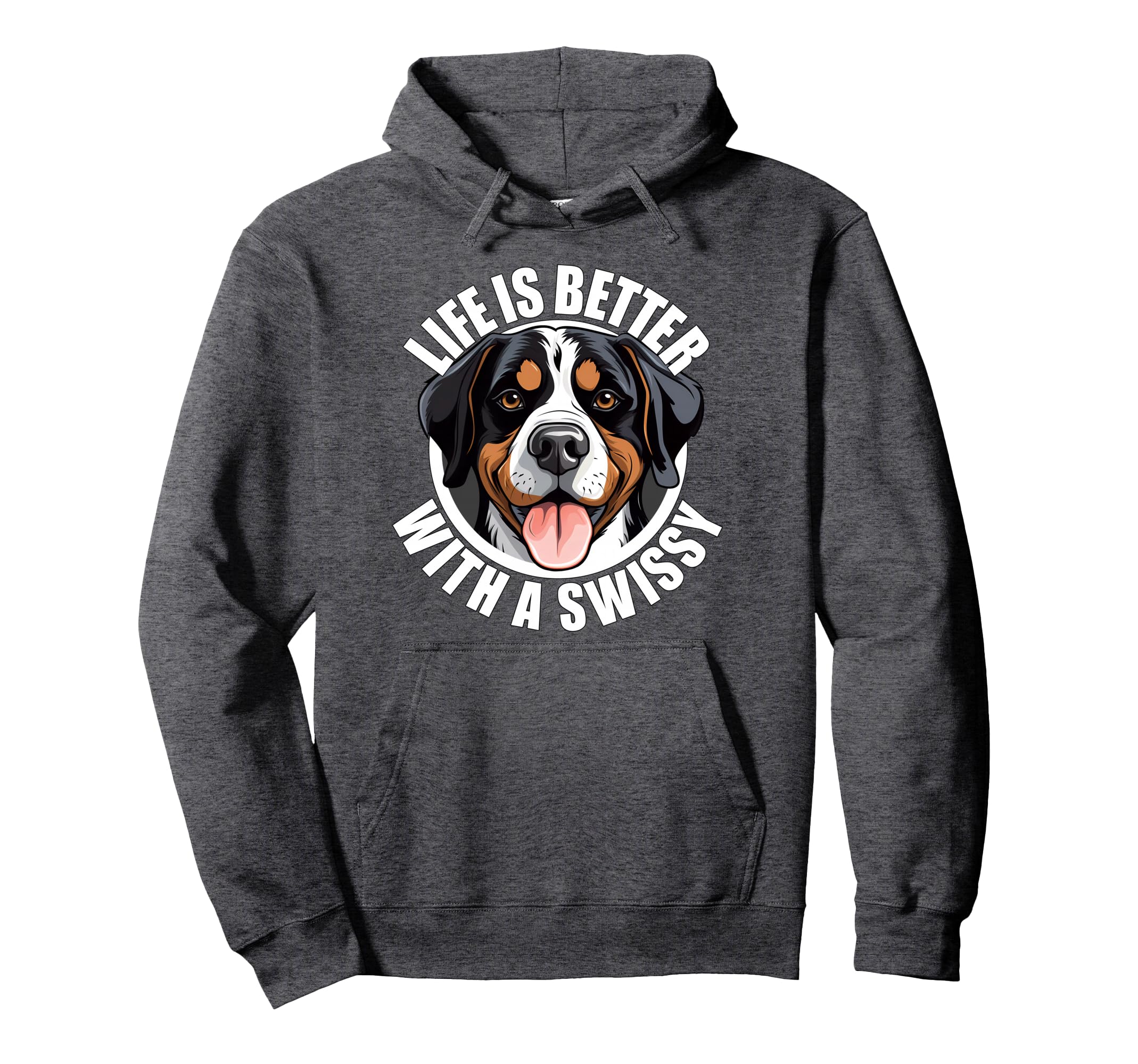 Life is Better with a Swissy. A funny design for Greater Swiss Mountain Dog lovers who know life is better with their dear puppy dog. Makes a great gift idea for any Swissy lover: Dog mom, dad, dog trainer, breeder, or anyone who just likes cute dogs. The Greater Swiss Mountain Dog looks adorable with a big good boi or good girl smile across its face. Makes a great Christmas gift or birthday gift for Swissy dog lovers of all kinds: for men, for women and for kids. 8.5 oz, Classic fit, Twill-taped neck