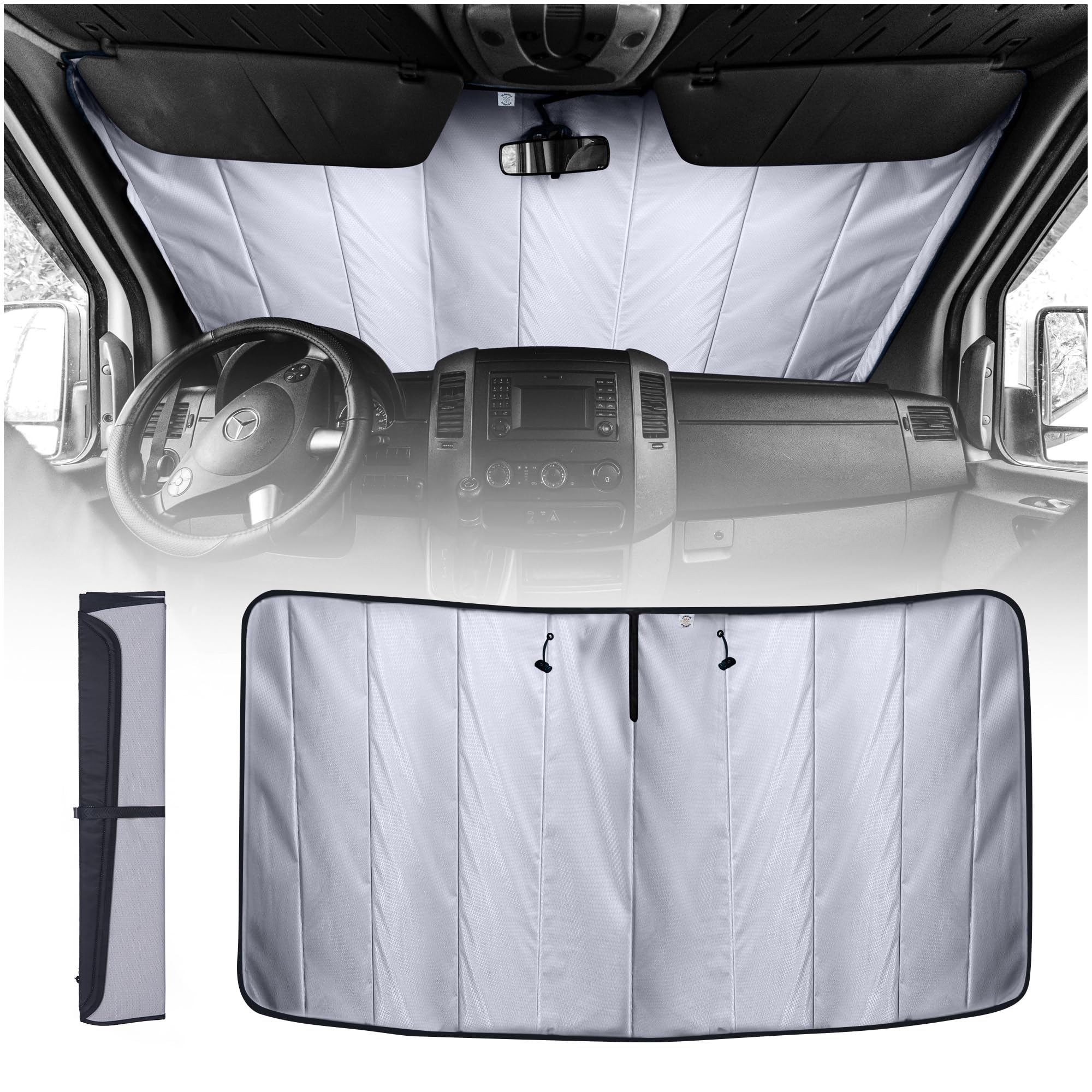 TEMPERATURE REGULATION - Crafted with UV50+ thick, premium insulation, these Mercedes Sprinter windshield covers will keep your van cool in the summer and warm in the winter. These blackout windshield covers will block out the elements, even in the most severe weather conditions. COMPLETELY BLOCKS LIGHT - These blackout sprinter van windshield covers fit snugly against your windows, blocking out 100% of light. These motorhome windshield shade are also ideal for ensuring complete van privacy. This is one more of essential sprinter van accessories you must have! ULTRA-EASY TO INSTALL - Install and remove in just seconds. Ensuring the perfect fit, strong fiberglass rods have been strategically sewn into the inside windshield covers. Held in place by your van‘s sun visors, no suction cups are required. DUAL COMPATIBILITY - Compatible with both rearview mirror and technology box. When not in use, these windshield covers fold up for small, compact storage. These van and RV blackout windshield covers are designed to fit any adventure lifestyle STEALTH CAMPING PROOF - These RV retractable windshield covers are also ideal to provide complete privacy. Whether you are looking to weather-proof your van or ensure complete indoor privacy, this is the ideal sun shade for windshield.