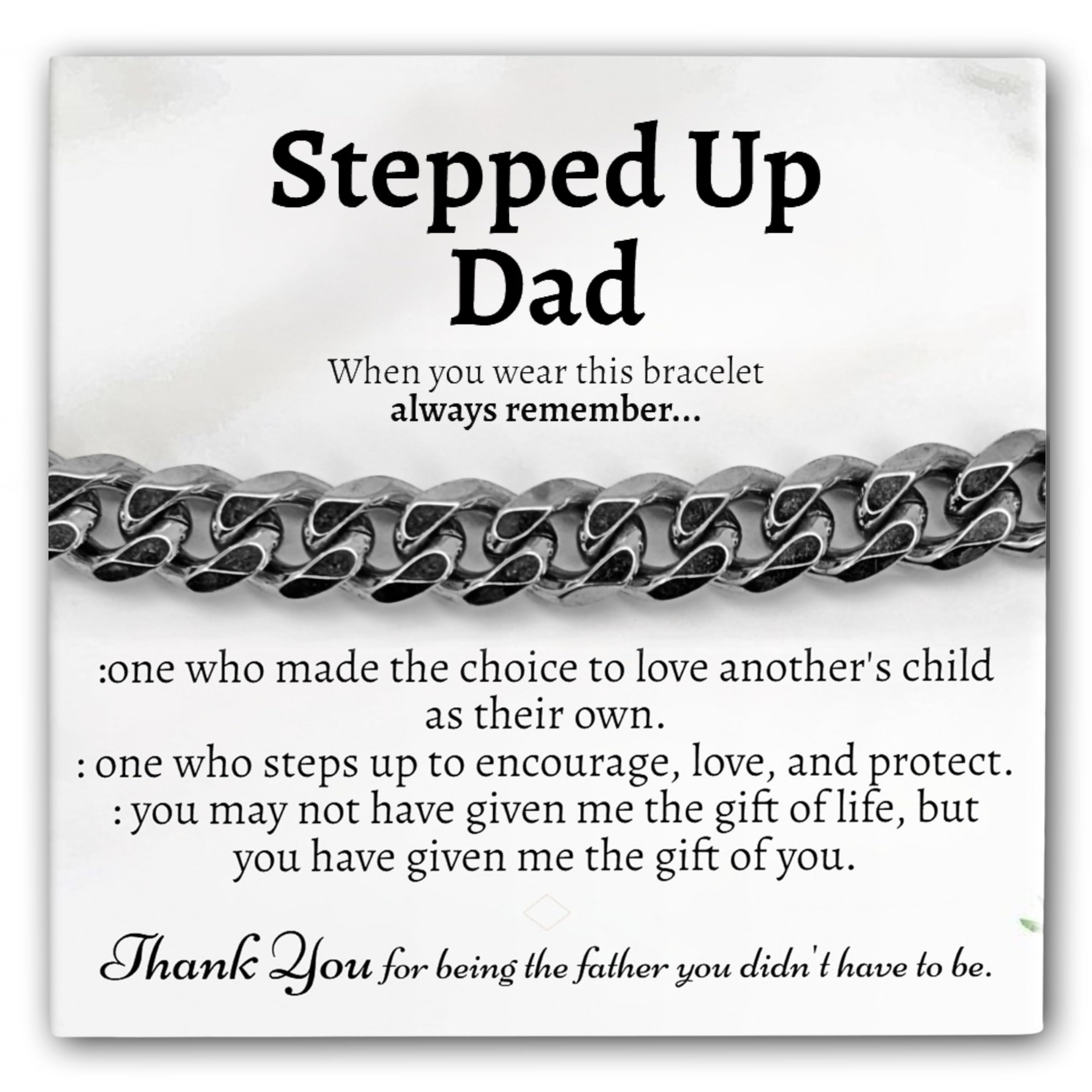 Stepped Up Dad Gift: Symbol of Strength & Choice: This Cuban chain represents the unbreakable strength of a man who chose to step up — not by obligation, but out of love. A perfect tribute to a stepped-up dad, bonus dad, or father figure. Heartwarming Message Card: Reads: "Stepped Up Dad - When you wear this bracelet always remember who you are to me. - One who made the choice to love another's child as their own. One who steps up to encourage, love, and protect. You may not have given me the gift of life, but you have given me the gift of you. Thank you for being the father you didn't have to be." Built for Daily Wear: Made of 316L surgical stainless steel — waterproof, hypoallergenic, rust-resistant, and safe for sensitive skin. Designed to last as long as your gratitude. Gift-Ready Presentation: Arrives in a premium gift box with a heartfelt message card — perfect for Father’s Day, birthdays, Christmas, or just because. Perfect step dad gifts from daughter, a heartfelt message card, luxury packaging - this gift set has it all, and it will let him know that your bond will forever be strong just like the intertwined links of this steel bracelet; best step dad gifts, bonus dad gifts, bonus dad gifts from daughter, stepfather gifts, gifts for stepdad birthday, gift ideas for step dad Comfortable Fit Guaranteed: 8" length plus 1" extender ensures a perfect fit for most wrist sizes — strong clasp keeps it secure through every moment of life. To the Man Who Stepped Up – Not the one who had to, but the one who chose to. This 5mm Cuban Link Bracelet isn’t just a gift — it’s a heartfelt thank you for the man who chose to show up. Whether you’re gifting this from a loving wife, a grateful girlfriend, or a child who now calls him “Dad,” this bracelet honors the man who didn’t need a title to be a father. Crafted from premium 316L surgical stainless steel, this bracelet is built as solid as the man receiving it. It’s hypoallergenic, waterproof, sweatproof, and tarnish-resistant, perfect for daily wear. Whether he’s working with his hands, chasing kids around the house, or out on date night — this bracelet stays as strong as he does. The 5mm thickness offers a bold, masculine look without being too flashy, and the 8" length + 1" extender ensures it fits comfortably and securely on most wrists. It’s a timeless style, made for a timeless kind of man — the one who shows up, gives his all, and loves like no one else. Each bracelet comes in a luxury gift box paired with a sentimental message card that says what words alone sometimes can’t: “You didn’t have to be here. But you are. And that means everything.” Whether for Father’s Day, his birthday, Christmas, or just to show your appreciation, this bracelet is a meaningful way to say, “You’re seen. You’re loved. You matter.” For the man who chose to stay, chose to love, and chose to lead — this is for him.
