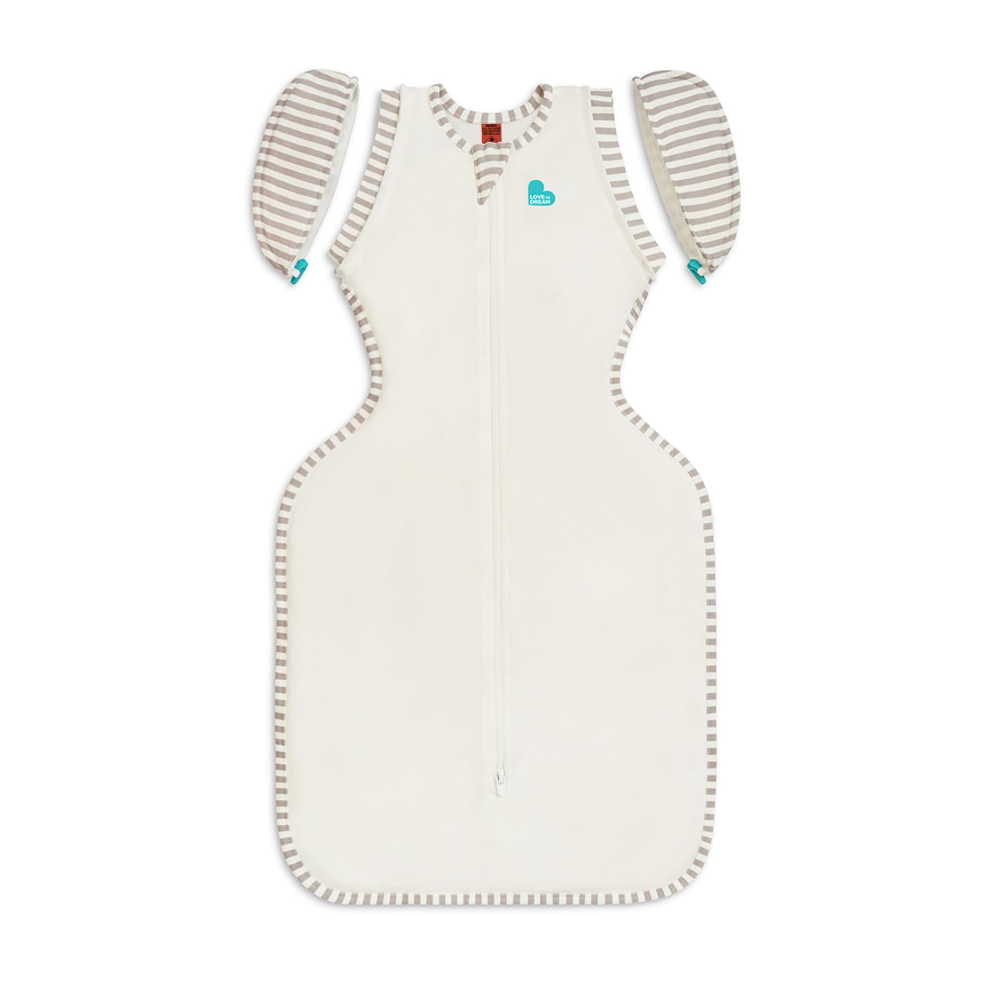 π & ππππππππ: The stretchy fabric moves with baby's body, providing excellent comfort, but also has a level of resistance to ensure the optimum arms up snug fit across the torso to assist with self-soothing. An ideal choice for MODERATE room temperatures between 68-75 degrees Love To Dream Swaddle UP Transition Bag Once your baby starts to show signs of rolling, it's time to stop swaddling and transition them to arms free sleep. Our unique Swaddle Up Transition Bag is an easy way manage this change, while helping to maintain an established sleep routine. Specially designed to provide the secure feeling of a swaddle, while the zip-off wings allow a gentler and gradual move to arms-free sleeping. Designed to Preserve Sleep Routine & Keeps Baby Settled Our uniquely designed zip-off wings allow for one arm to be free & the other swaddled, maintaining that familiar swaddled feeling. After a few nights, simply remove the remaining wing so both arms are free. This is an easy way to achieving arms free sleep while helping to preserve an established sleep routine. Once both wings are removed, continue to use as a sleeping bag providing the snug feeling baby is used to for longer-lasting use. Arms-Free also allows older babies to push up or reposition when they roll over. Easy to Use, Hip-Friendly Design Our Swaddle UP Transition Bag is designed to provide ample room for baby's legs and hips to move naturally, allowing for healthy hip development. The clever two-way zipper mechanism means quick and easy diaper changes for any parent, grandparent or carer, even in the middle of the night. The light, super soft and stretchy fabric is ideal for warm room temperatures between 75Β°F & 81Β°F. Fabric content: 97% Cotton 3% Elastane. From the unique original Swaddle Up, to bedding and Self-Soothing Toys, the Love To Dream range has grown to provide a portfolio of sleep solutions designed for children up to four years old.