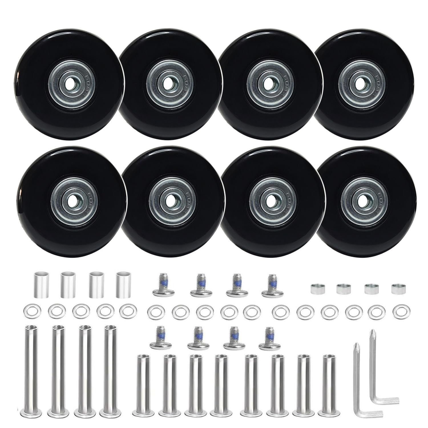 UNIVERSAL FIT: This set of 8 replacement wheels features 2 different size axles and 6mm to 8mm shaft spacers to fit a variety of luggage and carts with outer diameters of 2inch/50mm, wheels house wider than 0.6inch/16mm. SMOOTH ROLLING: Constructed with sturdy polyurethane tires and precision bearings, these wheels provide smooth rolling over various surfaces up to 100 lbs capacity per wheel. EASY INSTALLATION: Installation is quick and simple with the coming tools and parts- remove old wheels make take a little time so electric drill or saw was recommend,then slide on new wheels, and use suitable axle,spacers and lock the screws. LONG-LASTING DURABILITY: Reinforced PU rubber construction and corrosion-resistant metal axles and bearings ensure these wheels withstand regular use and handling. MULTIPLE APPLICATIONS: In addition to luggage suitcase, these wheels can be used for shopping carts, trolley bag,in-line roller skates,wagons, dollies, and more - with measurements of 50mm diameter x 16mm bearings width This replacement set of 8 wheels and axles is a must-have for keeping luggage rolling smoothly. Featuring sturdy PU rubber construction, these wheels are designed to withstand years of travel while protecting your bags from scratches. The 360 degree spinning ability reduces stress on shoulders when navigating busy airports or train stations. Installation is quick and easy with the included axles fitting most standard suitcases. Lightweight and compact, this set fits easily into any carry-on. Whether it's time for an overseas adventure or a weekend getaway, these caster wheels will have bags gliding effortlessly from plane to car to hotel.