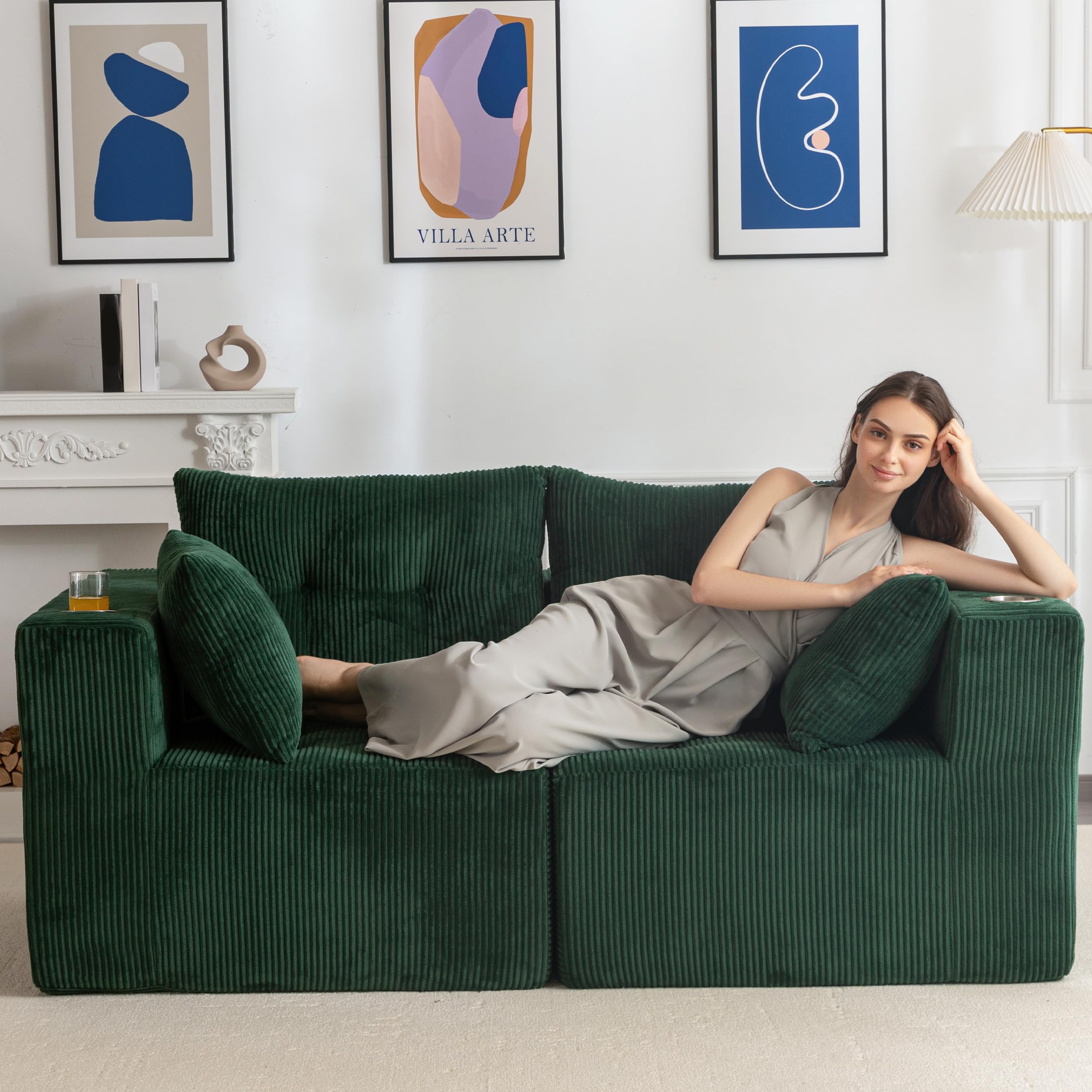 Modular Sectional Loveseat: The cloud modular sectioal sofa adopts modular splicing structure. Each module is individually moulded and can be split or combined at will, making it easy to cope with changes in space. Whether it's a compact flat or an open-plan living room, the layout can be adapted to utilise the space, which is convenient for you to read books, play games, watch TV and other leisure activities No Assembly Required: No assembly required, after receiving a package, open it and place it in a ventilated and dry environment, wait for about 12 hours or so to be able to return to its original shape, meanwhile, gently pat each part to improve its elasticity and luster, you can enjoy a comfortable experience! Handy Cup Holder & Side Pockets: The embedded cup holder design at the armrest makes it easy to hold a drink at your fingertips, so you don't need to leave your seat when watching a film or reading a book. Side invisible storage pockets cleverly integrate practical functions, can store magazines, remote control, eye masks, etc., always keep the space neat and orderly Soft Corded Fabric: Upholstered in premium corded fabric, the sofa surface is soft, breathable and skin-friendly. It brings serene warmth, offering soft comfort. Its ribbed texture adds depth and modern style, making it a cozy focal point in any living room or lounge space High-resilience Filling: The cloud sectional couch is filled with high-density elastic filling inside, providing good support and enjoying a cloud-like comfortable sitting experience. Backrests and pillows provide lumbar and neck support, relaxing your body and experiencing a relaxing rest time. The handmade tufted button craft highlights a light luxury texture and embodies the aesthetic of home comfort
