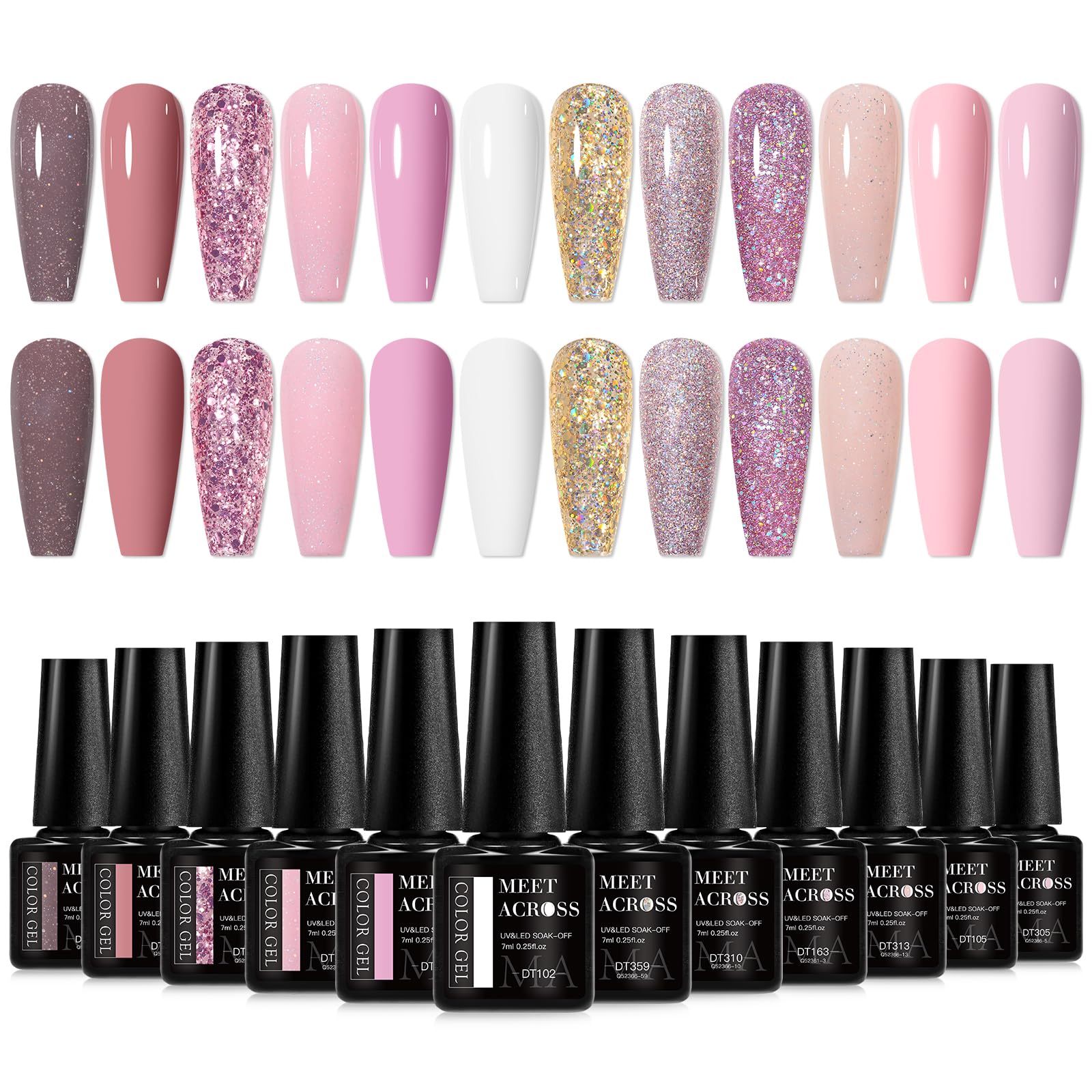 Classical Gel Nail Polish Kit: 6 iconic and cutting-edge shades include baby pink light pink glitter pink violet pink and jelly pink. This pink tones set not only complements your style but also reflects your individuality. Long-lasting Salon Quality: This pink tones collection set can be used with all brands of top and base gel, but of course, with MEET ACROSS the effect is better. This set is long-lasting for two weeks with perfect shine under the proper application. Exclusive Salon at Home: Indulge in self-care as you pamper yourself with salon worthy treatments, unleash your creativity and enjoy the satisfaction of becoming your own nail artist. You can enjoy the pleasure of manicures with your friends and family. Healthy Formulation: With upgraded, natural ingredients, this kit ensures nail safety and smooth gel application. It's convenient and healthy, the gel nail polish texture is sleek, brush stroke-free, effortlessly self-leveling without air bubbles. Ideal Gift Option: Nice for gifting occasions like Christmas, Thanksgiving, Valentine's Day, Easter, Mother's Day, Women's Day, and more. Encourage artistic talent and the joy of DIY nail art. Besides, you can enjoy a family salon happy hour with your friends and family.
