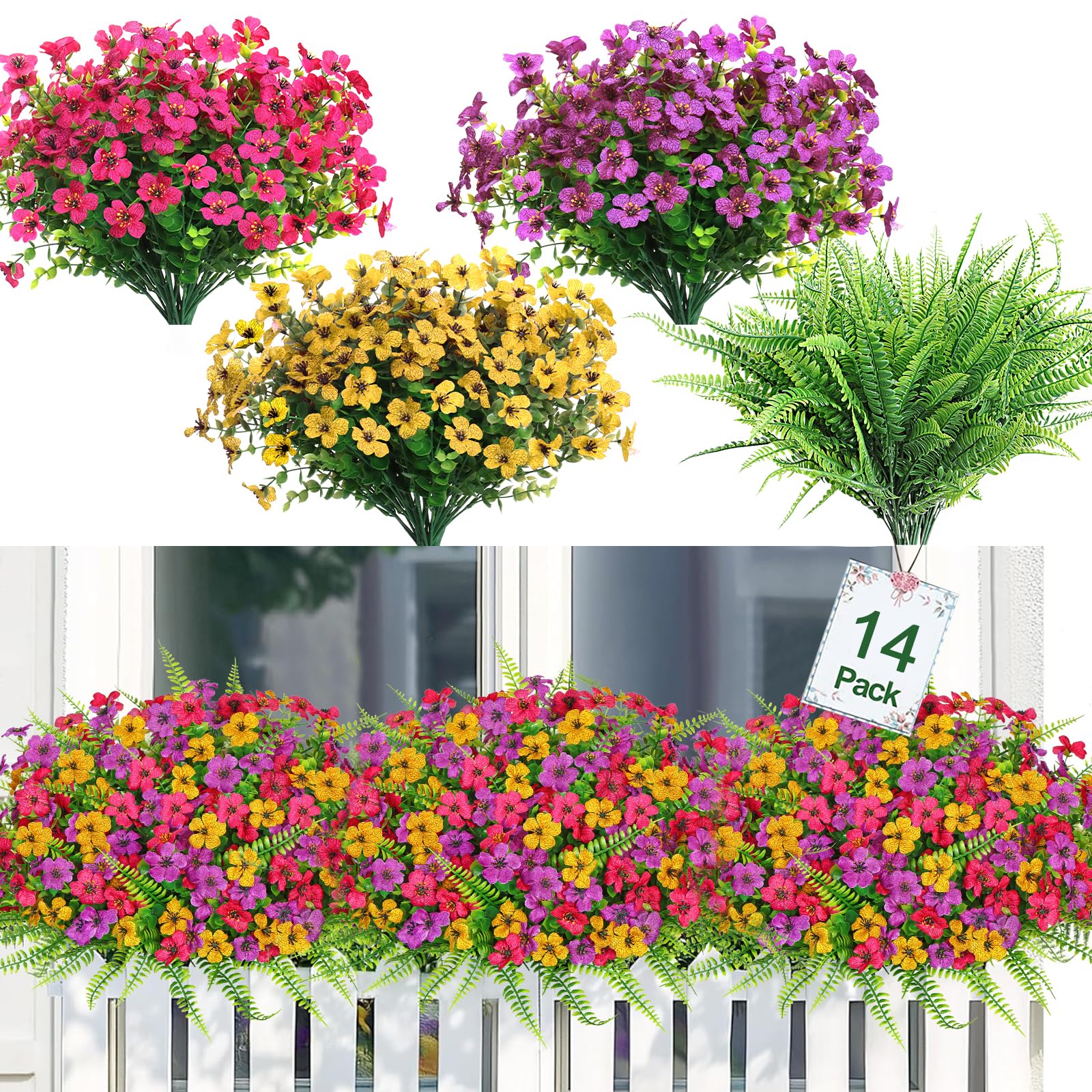 Lush Artificial Flowers and Plants:The artificial ferns for outdoors are made of quality silk and plastic eucalyptus leaves.These artificial daisy flowers look lifelike,very beautiful. Moreover, these outdoor faux plants are UV-resistant, colorful, and never wilt, blooming all year round. These flowers and ferns can infuse natural beauty into your living spaces.It is also very friendly to people with pollen allergies. Quality Material& No maintenance:The fake fern and flowers are made of soft silk and premium quality plastic, which is non-toxic and harmless. No maintenance, no watering, no fertilization, UV-resistant, convenient and easy to decorate. It is long lasting and can keep your house full of life for a long time. Multi-Scenario Application:These lush and plastic flowers are perfect for landscaping project. Perfect for home, hotel, office, terrace, guesthouse, Christmas, holidays, memorial places, DIY floral arrangement or other indoor and outdoor decorations. Spring Summer Decoration:UV protection and non-fading. This UV-resistant artificial outdoor plant can maintain its beauty in any season and at any occasion, without any need for maintenance. It is an excellent decoration for spring and summer. Package Include:1 pack include 14 bundles artificial fake ferns and flowers in total,featuring 4 bundles magenta,3 bundles purple,2 bundles yellow daisy flowers and 5 bundles ferns.You can DIY these different colors flowers according to your personal preference. Colorful blooms allows for creating stunning flower arrangements and bouquets. MEIVINES 14 Bundles Faux Daisy Flowers and Ferns Outdoor