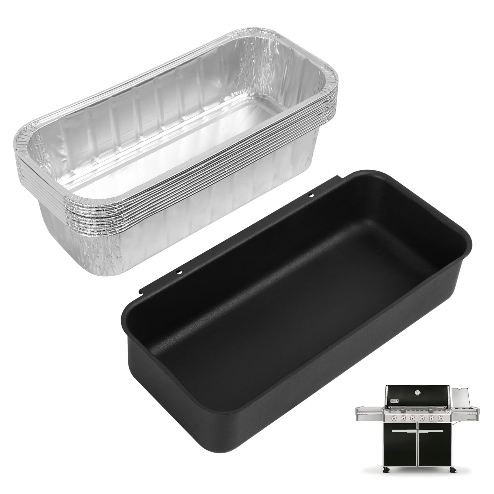 MOASKER 70379 Catch Pan & 6498 Drip Pan Liners for Weber Genesis II 400/600, Summit 400/600 Series Grills, Steel Grease Tray & 6417 10Pcs Foil Grease Pan Liners for Weber SmokeFire & 28''/36" Griddle